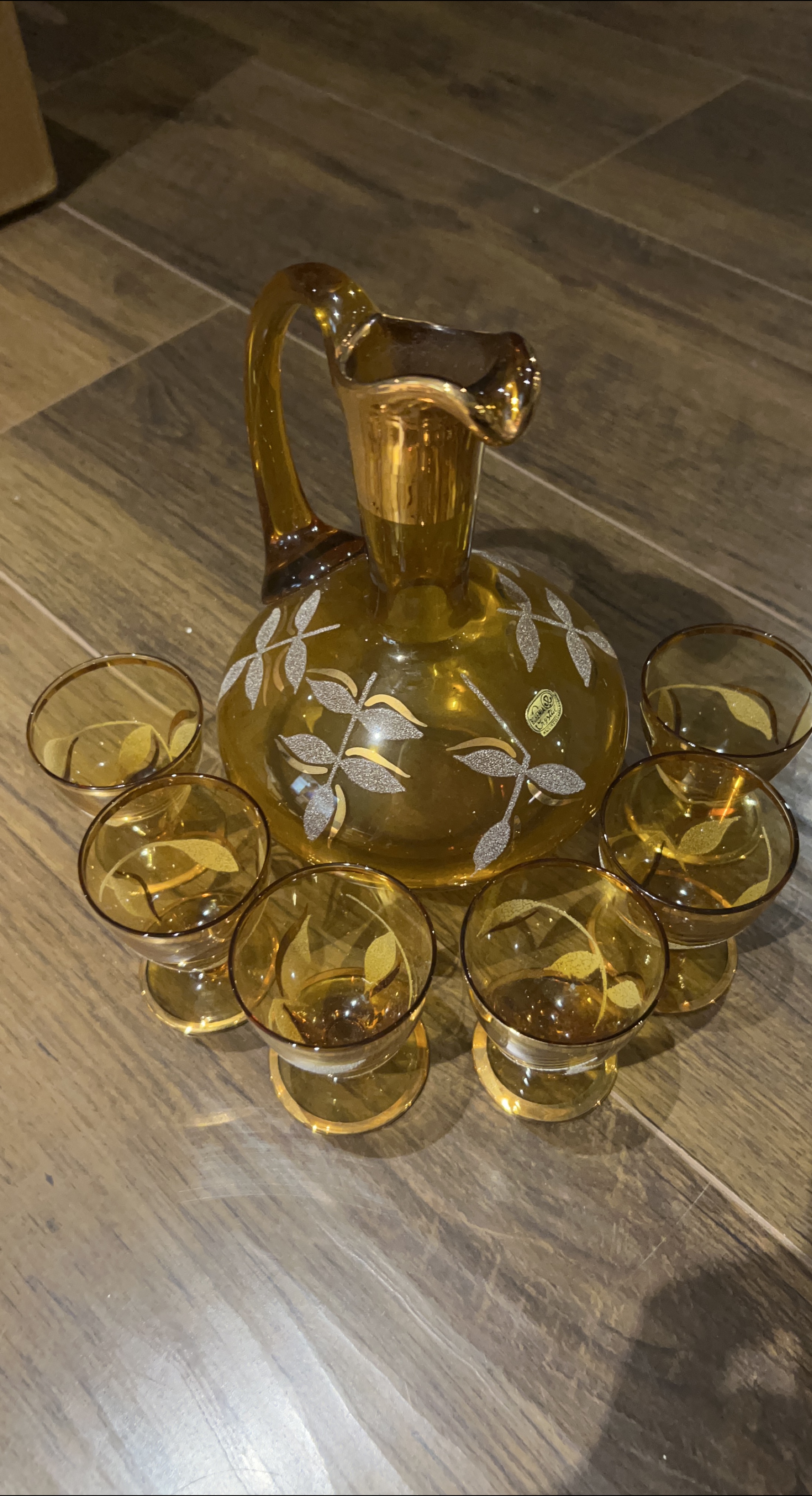 Beautiful amber glass pitcher set by Bohemia Crystal! The set includes the pitcher and six matching glasses. Perfect for serving your favourite drinks in style!