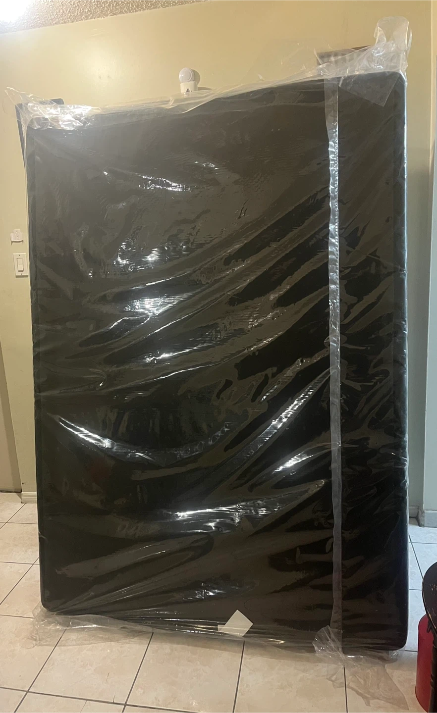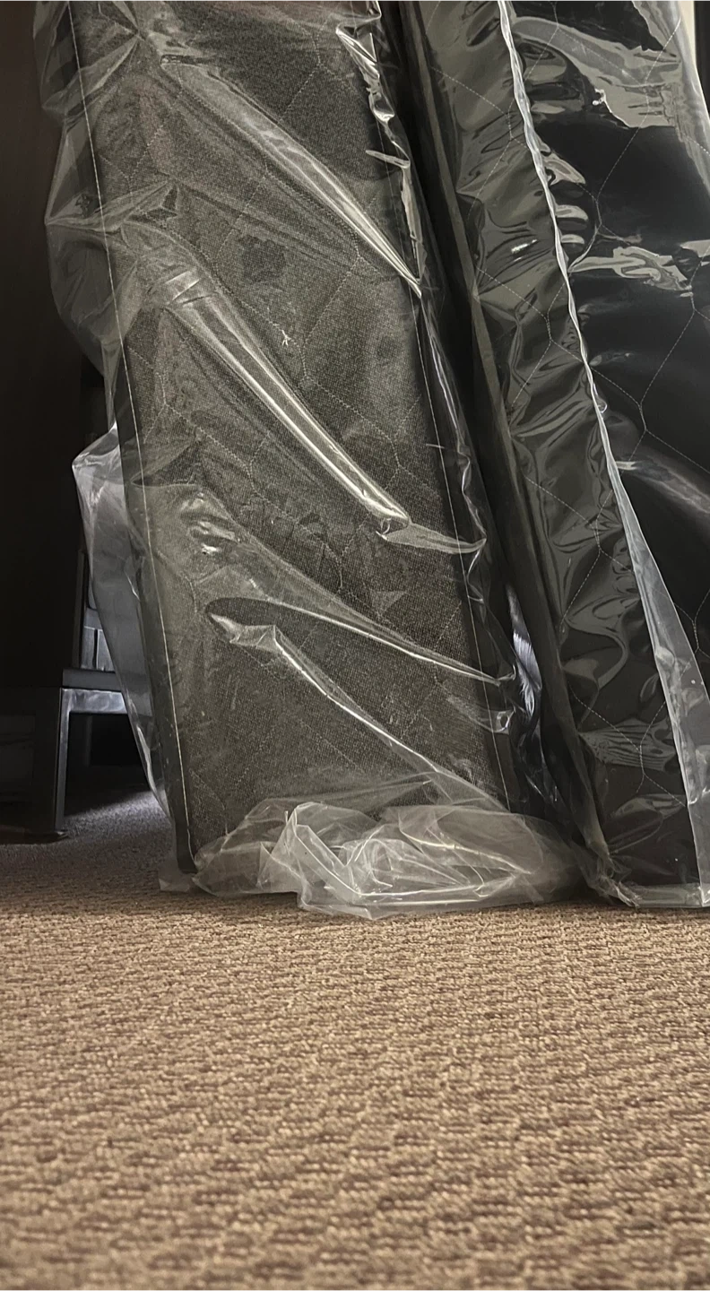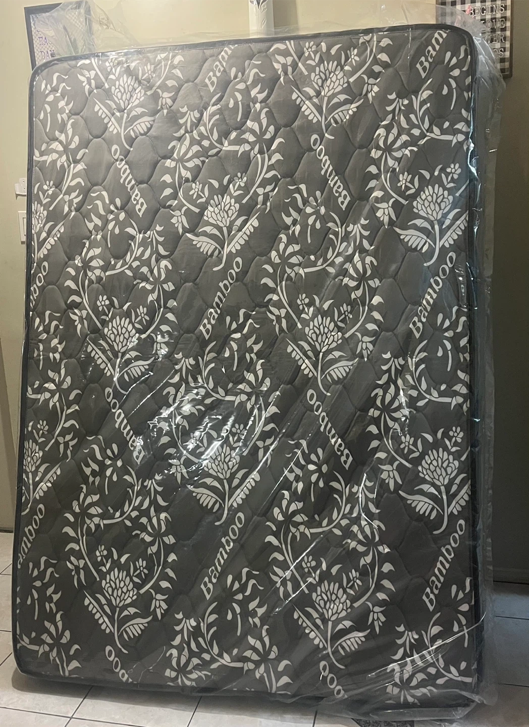 Double/ Full size bamboo mattress with a grey and white floral pattern. It's wrapped in plastic for protection. Mattress legs are also included, bundled in a separate plastic bag. Suitable for a bedroom. Also comes with a boxspring