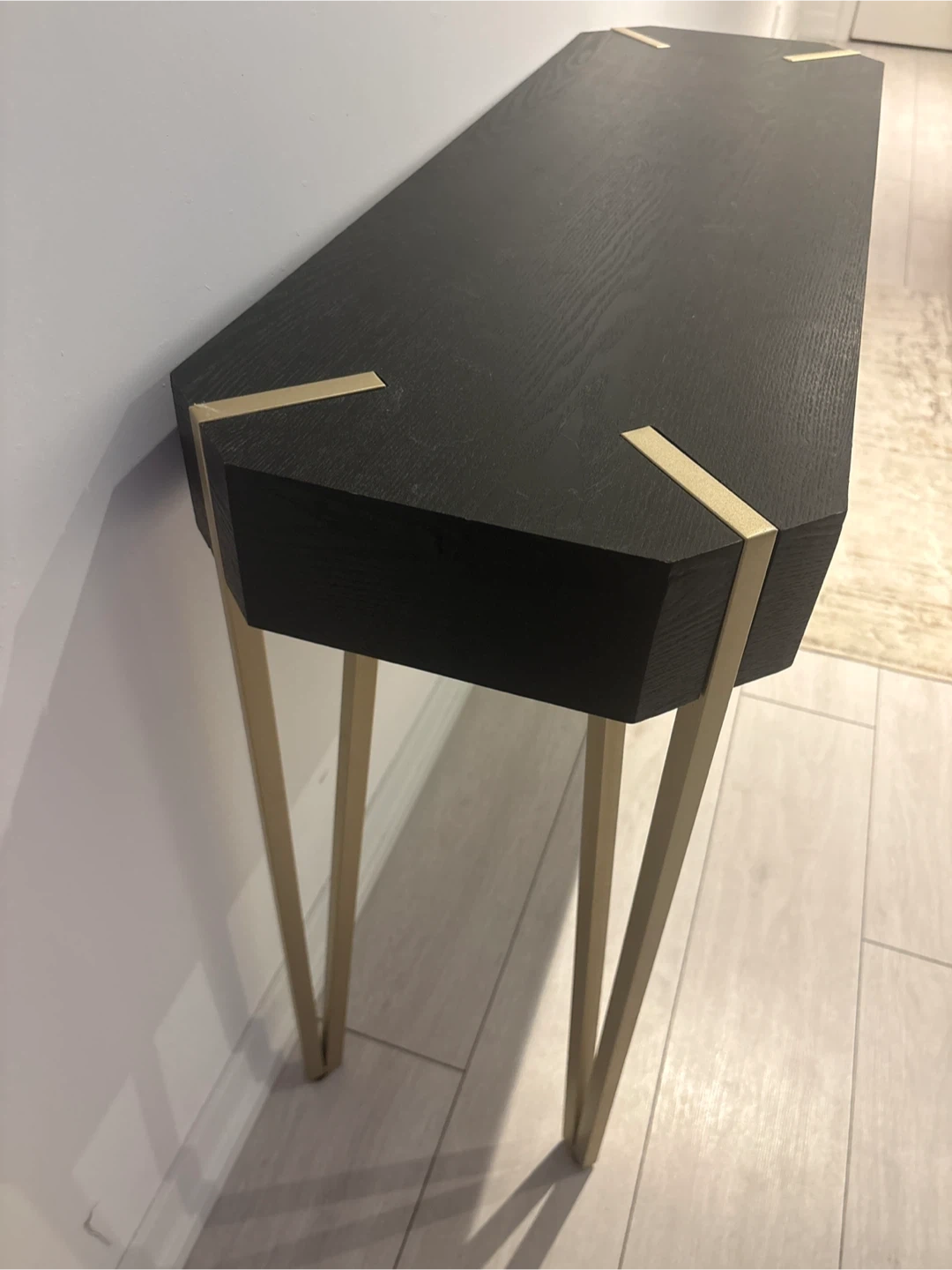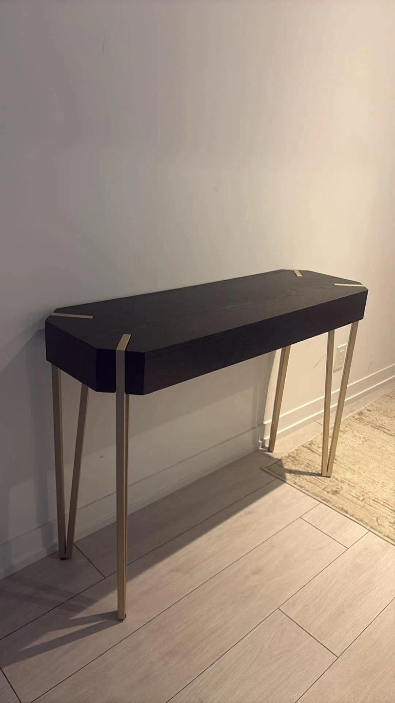 This sleek console table features a dark wood top with distinctive gold corner accents. It's supported by slim, angled gold metal legs. Its modern design makes it a statement piece for entryways or living areas.