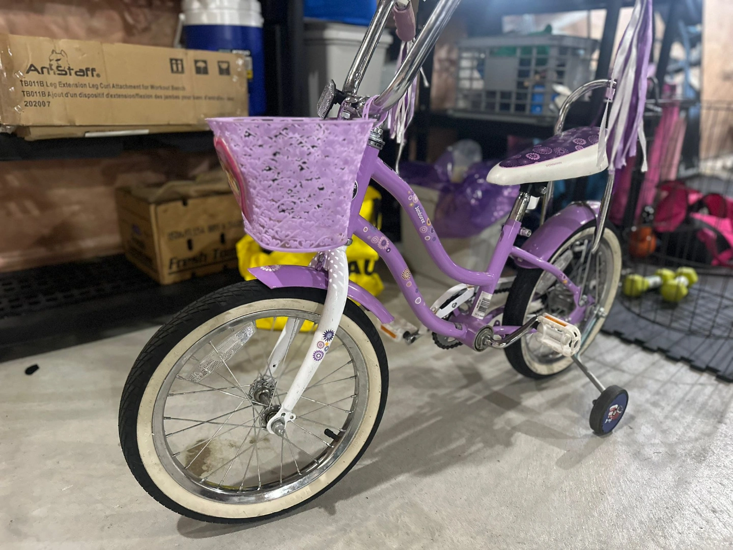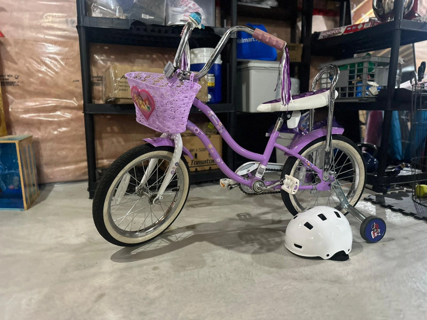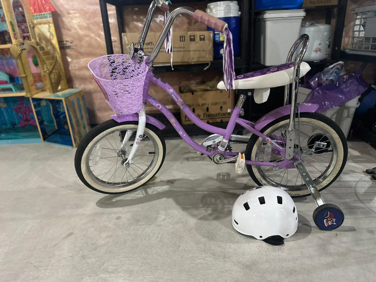 Girls' purple princess schwinn bike. Features a front basket, training wheels, and streamers on the handlebars. Great for younger riders. Comes with a white helmet.