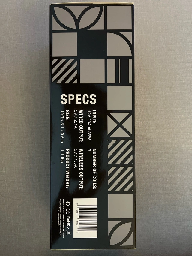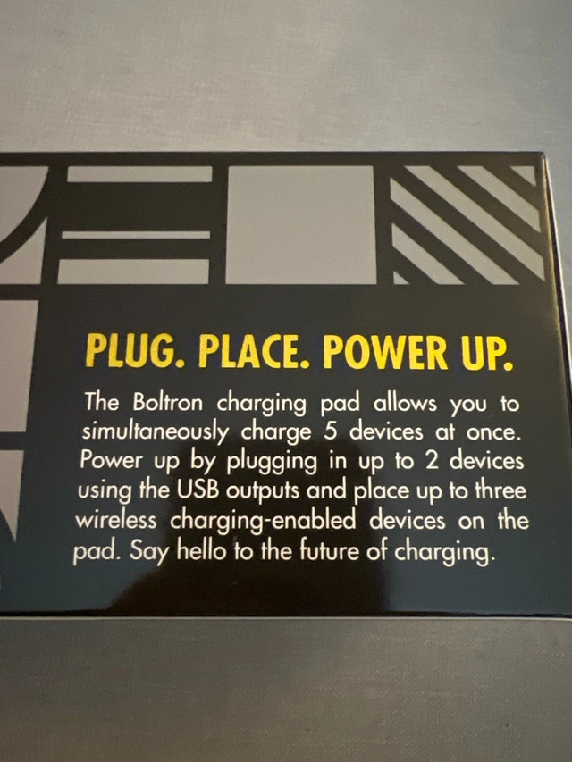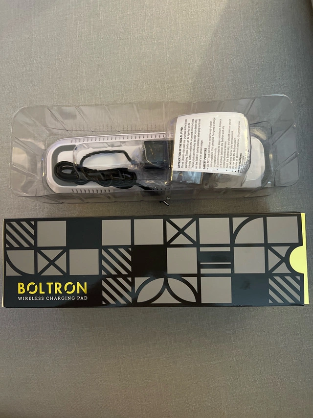 101This Boltron Wireless Charging Pad allows you to efficiently charge multiple devices at once, featuring three coils for optimal charging speed. This charging pad is new, still in its original packaging, ready to power up your devices! Specifications: * Input: 12V/3A at 36W * Wired Output: 5V/2.1A * Wireless Output: 5V/1.5A * Number of Coils: 3 * Size: 10.9 x 3.1 x 0.5 in * Weight: 1.1 lbs It is available, if the ad is up!