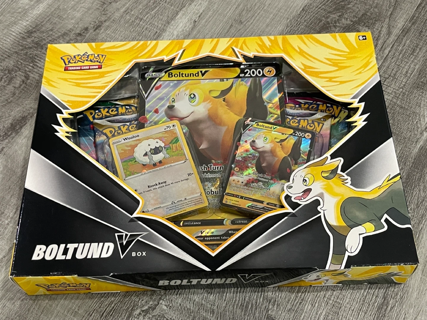 15Selling a sealed, brand new Boltund V Box. The box contains: • 1 Foil Promo Featuring Boltund V • 1 Foil Oversized Card Featuring Boltund V • 1 Foil Promo Card Featuring Wooloo • 4 Pokemon TCG Booster Packs (1x Evolving Skies, 1x Fusion Strike, 2x Brilliant Stars) • a Code card for the Pokemon TCG online game.