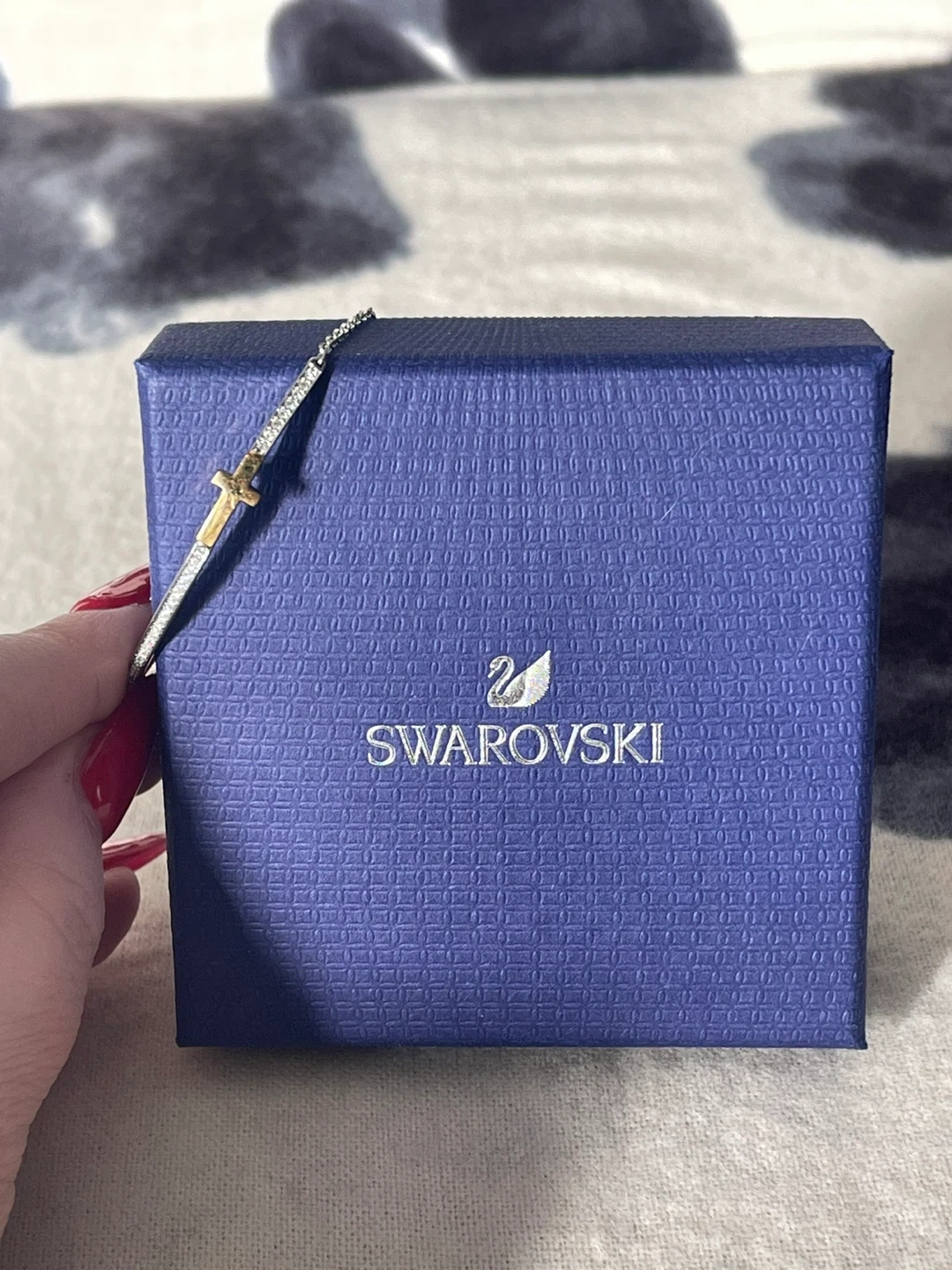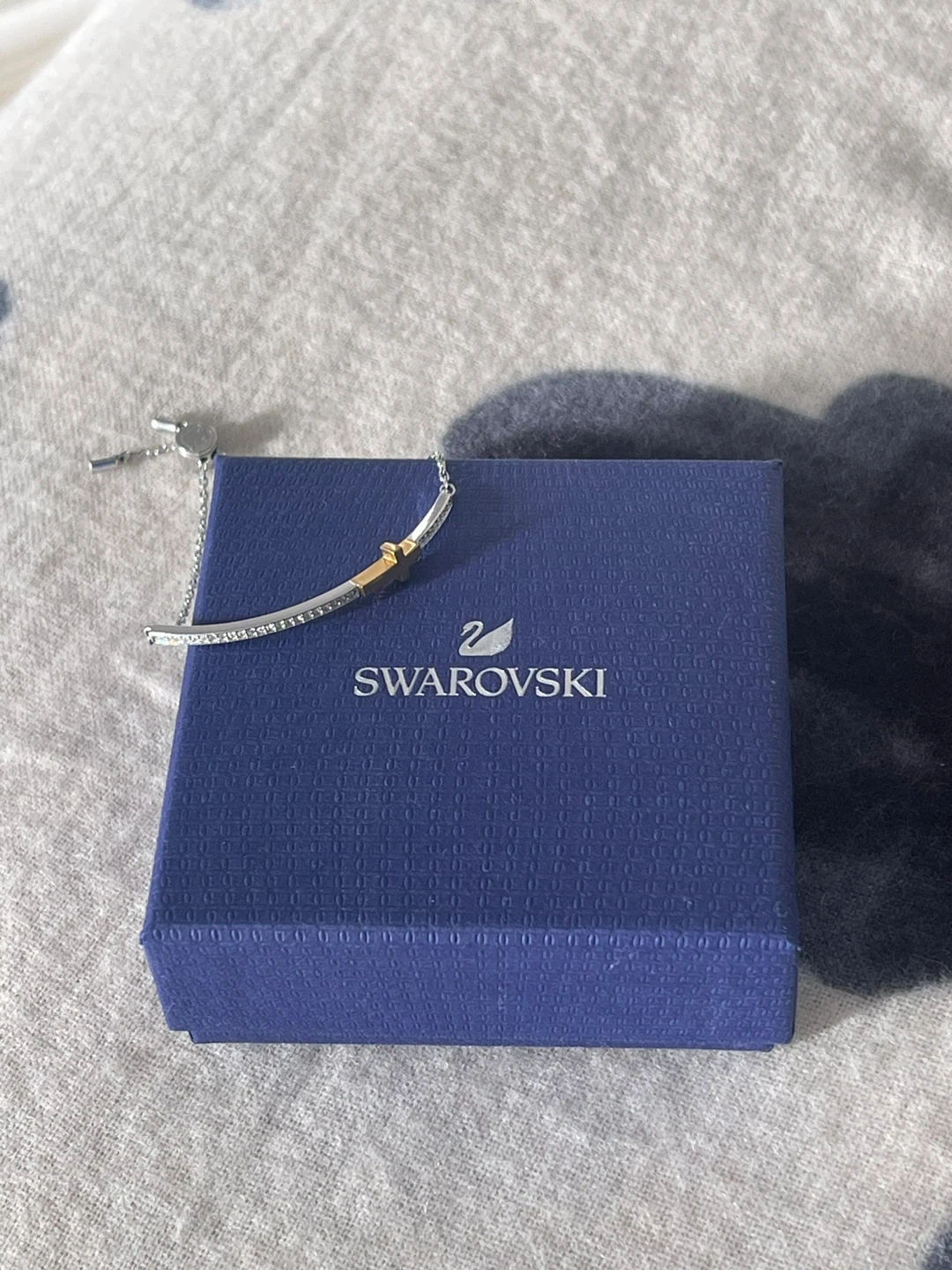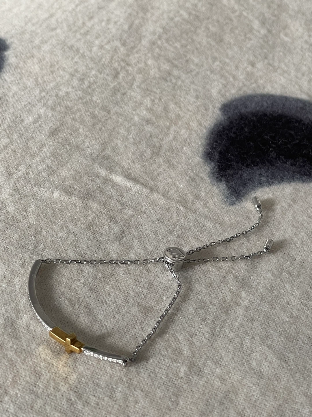 Authentic Swarovski bracelet. Stylish bracelet with a gold cross accent. Size adjustable and easy to put on by yourself, secure sliding closure. Ideal for versatile wear.