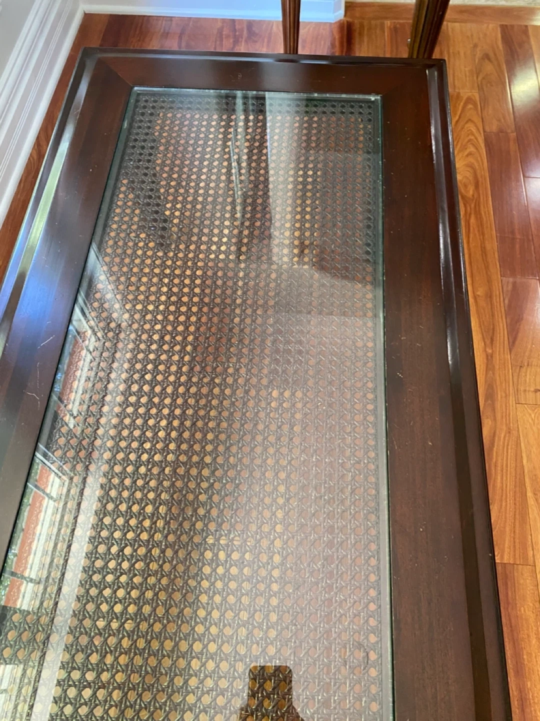 Selling a coffee table with a glass top and dark wood frame. It has a woven cane-like insert under the glass. The table is in good condition with some minor signs of use on the wood.