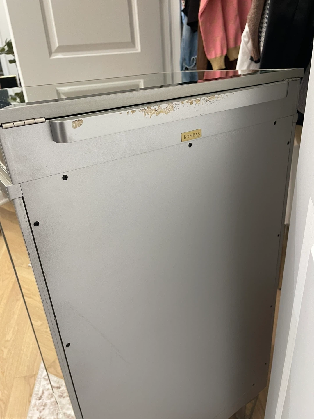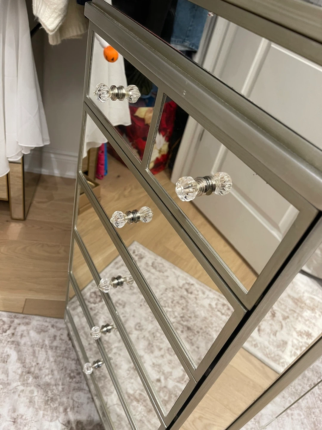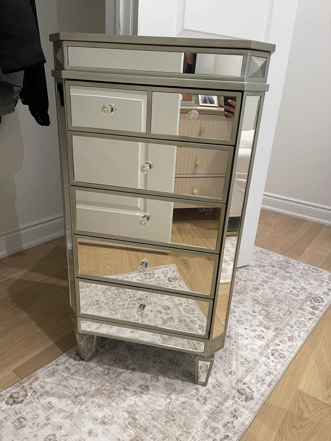 Selling a Bombay mirrored jewellery chest. It features multiple drawers and a top compartment for organizing your jewellery and accessories. The mirrored finish adds a touch of elegance to any room. It's in good condition, all organizing inserts are included (no costume jewelry)