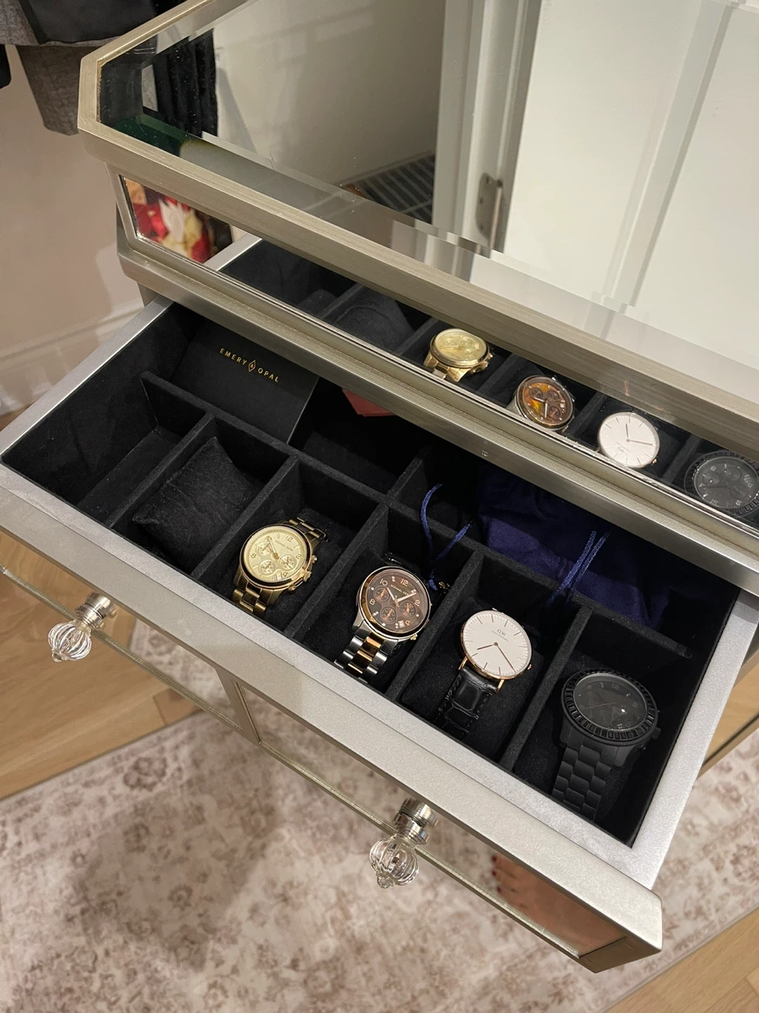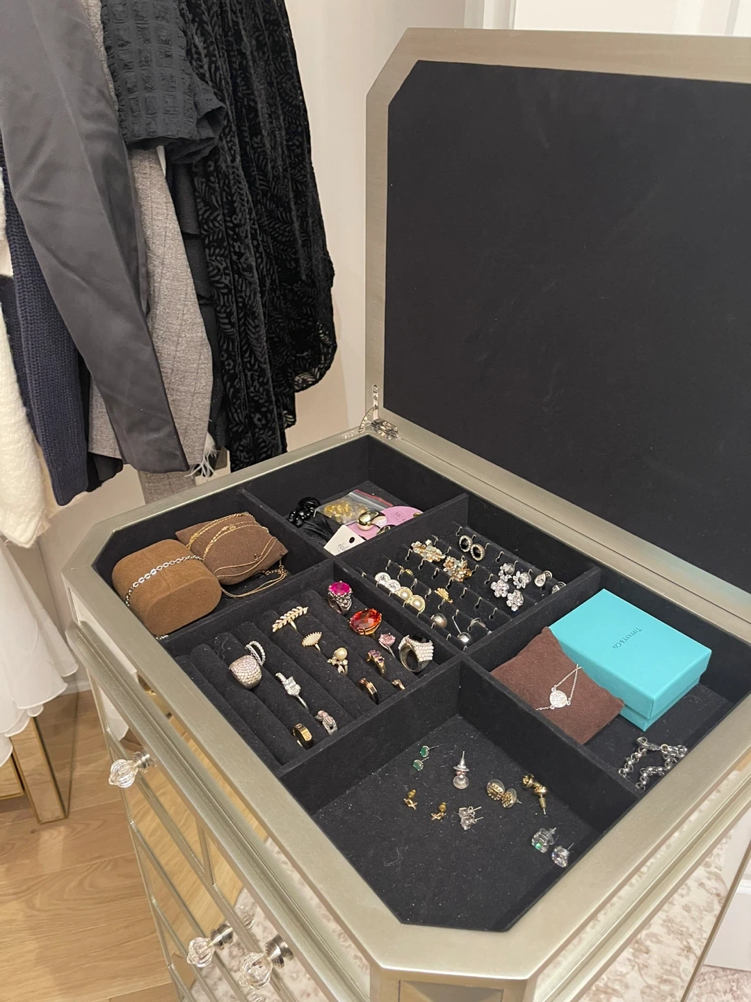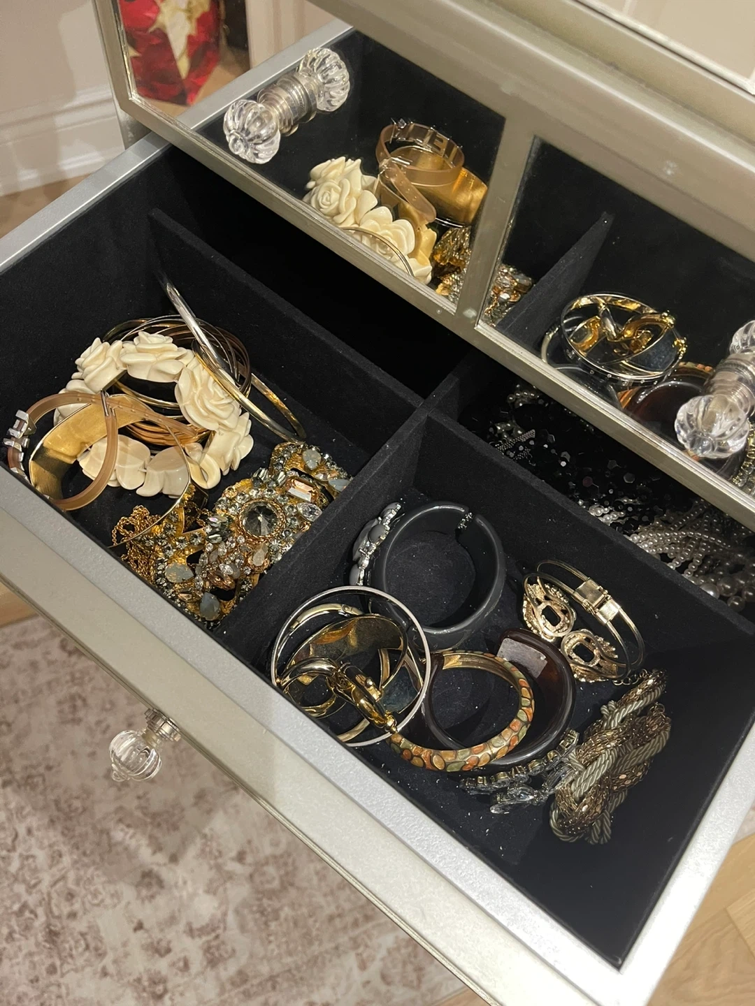 Selling a Bombay mirrored jewellery chest. It features multiple drawers and a top compartment for organizing your jewellery and accessories. The mirrored finish adds a touch of elegance to any room. It's in good condition, all organizing inserts are included (no costume jewelry)