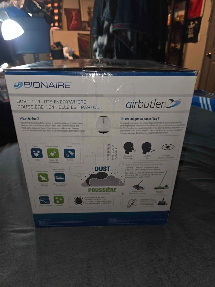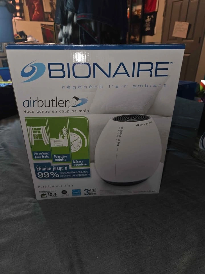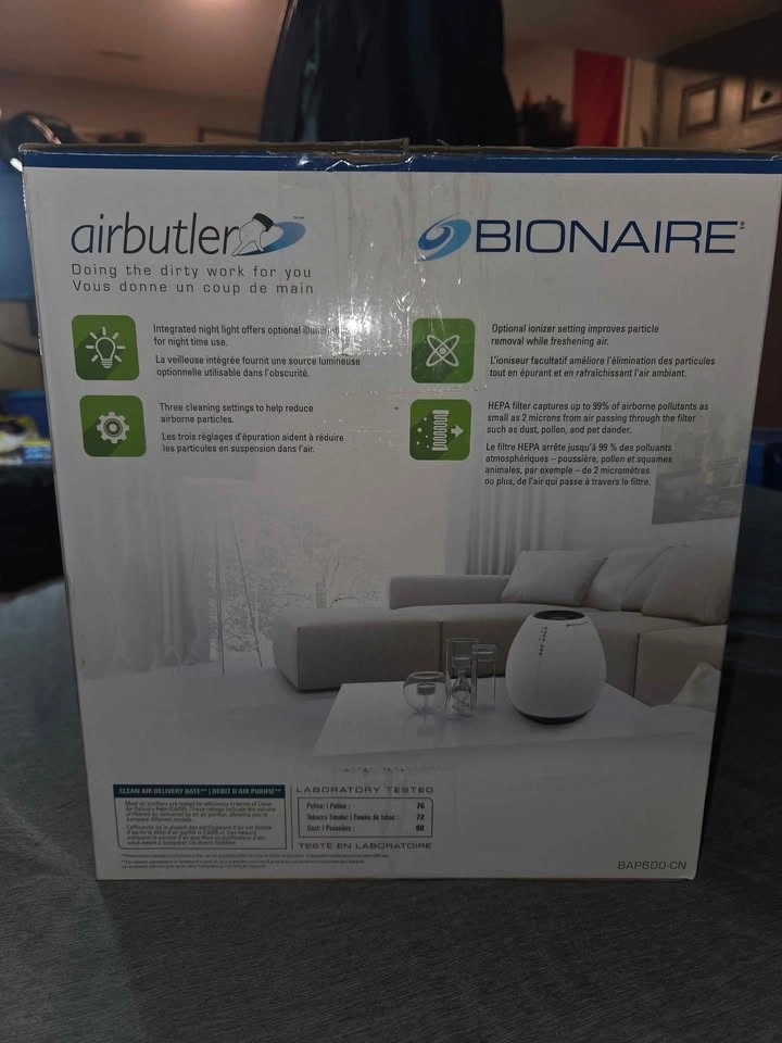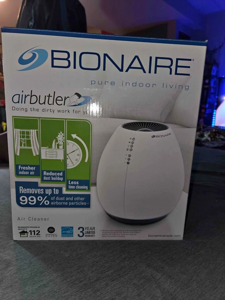 65Bionaire Airbutler Air Cleaner, specifically the Bionaire BAP600 Permanent HEPA Filter Air Purifier. Features: This air purifier utilizes a permanent HEPA-type filter to capture up to 99% of airborne particles as small as 2 microns, including dust, pollen, and pet dander. It also includes an optional ionizer setting for enhanced particle removal and air freshening. Design & Functionality: It features a sleek, egg-shaped design and offers three cleaning settings. It also has a built-in filter clean monitor with an LED indicator light and a soft blue nightlight. Filter Maintenance: The permanent HEPA-type filter is designed for low operational maintenance, though a washable pre-filter can extend the period between HEPA filter cleanings. Recommended Use: The BAP600 is recommended for small rooms, with a suggested cleaning area of 112 sq. ft. at 6 air changes per hour.