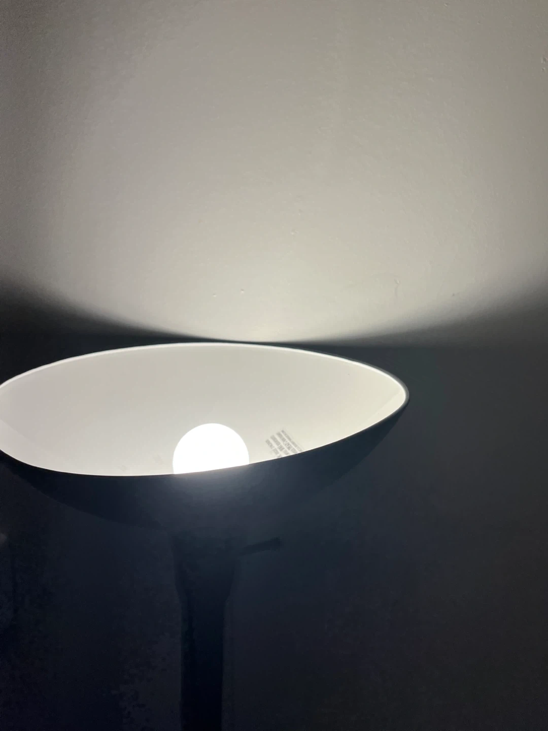 This is a black floor lamp. It has a sturdy round base and a tall slender pole. The lamp shade is a wide bowl shape, perfect for directing light upwards or downwards.
