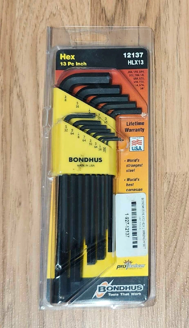 10I'm selling a Bondhus Hex Key Set, which includes 13 SAE sizes, made with Protanium steel for superior strength and a ProGuard finish for rust prevention. These keys are new and perfect for any toolbox. Key Features: * SAE Sizes: Includes 13 essential SAE sizes. If this ad is still up, then yes, it’s still available! No need to ask, just let me know when you'd like to pick it up.