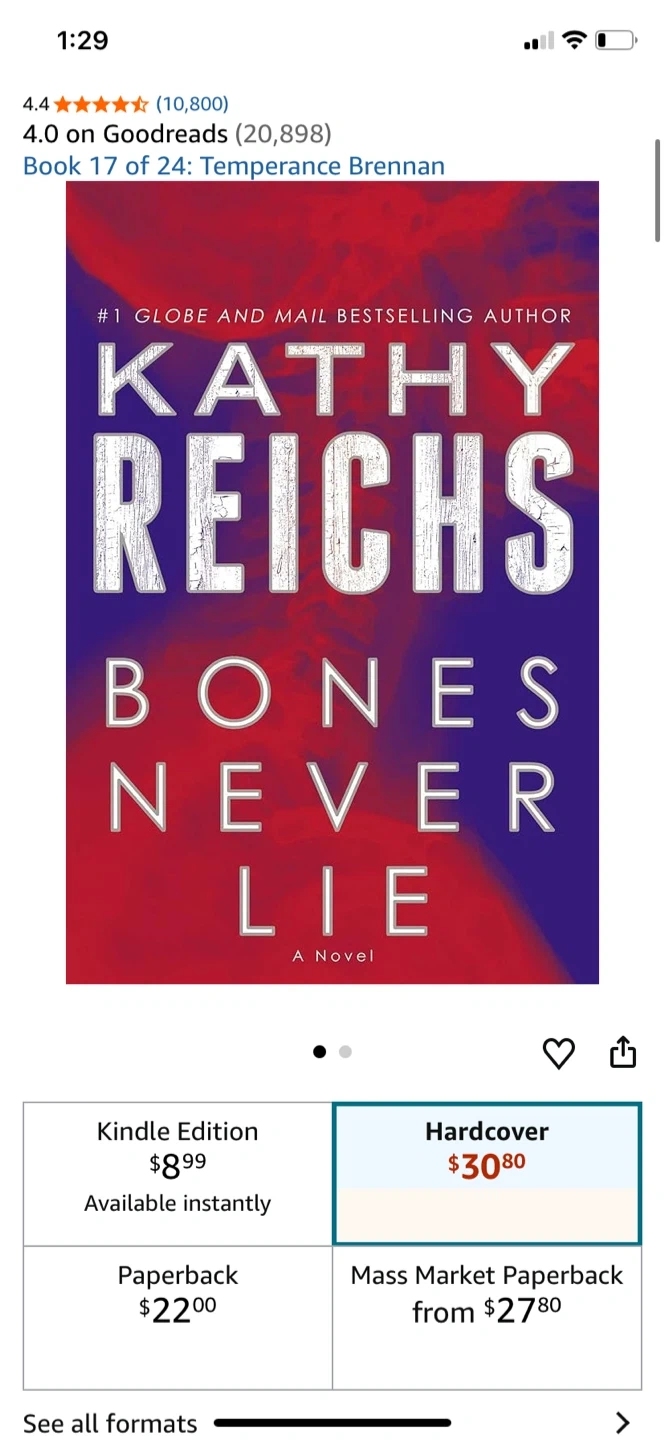 96Selling a hardcover copy of Bones Never Lie by Kathy Reichs. It's a novel in the Temperance Brennan series. Originally bought for $32.