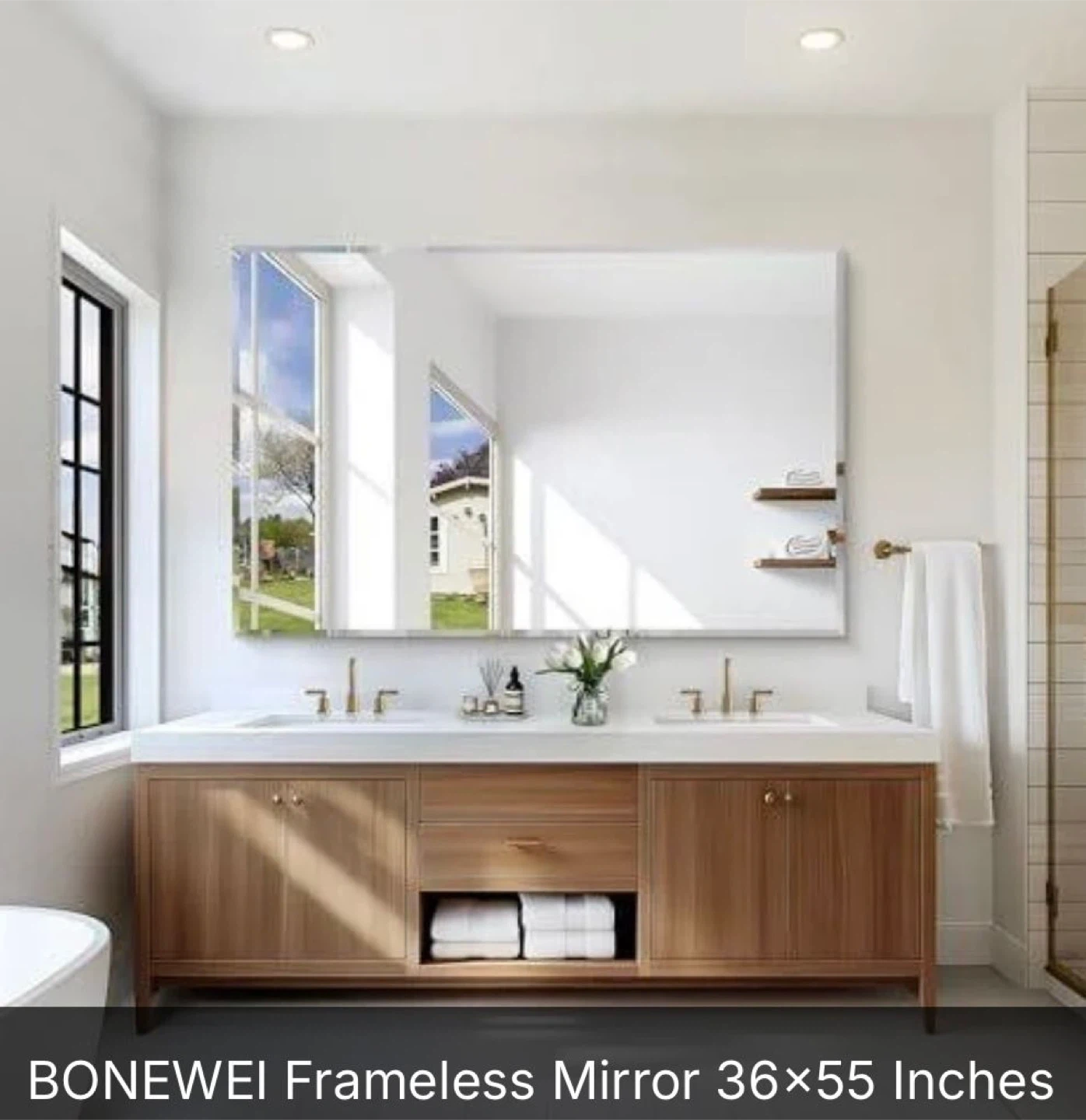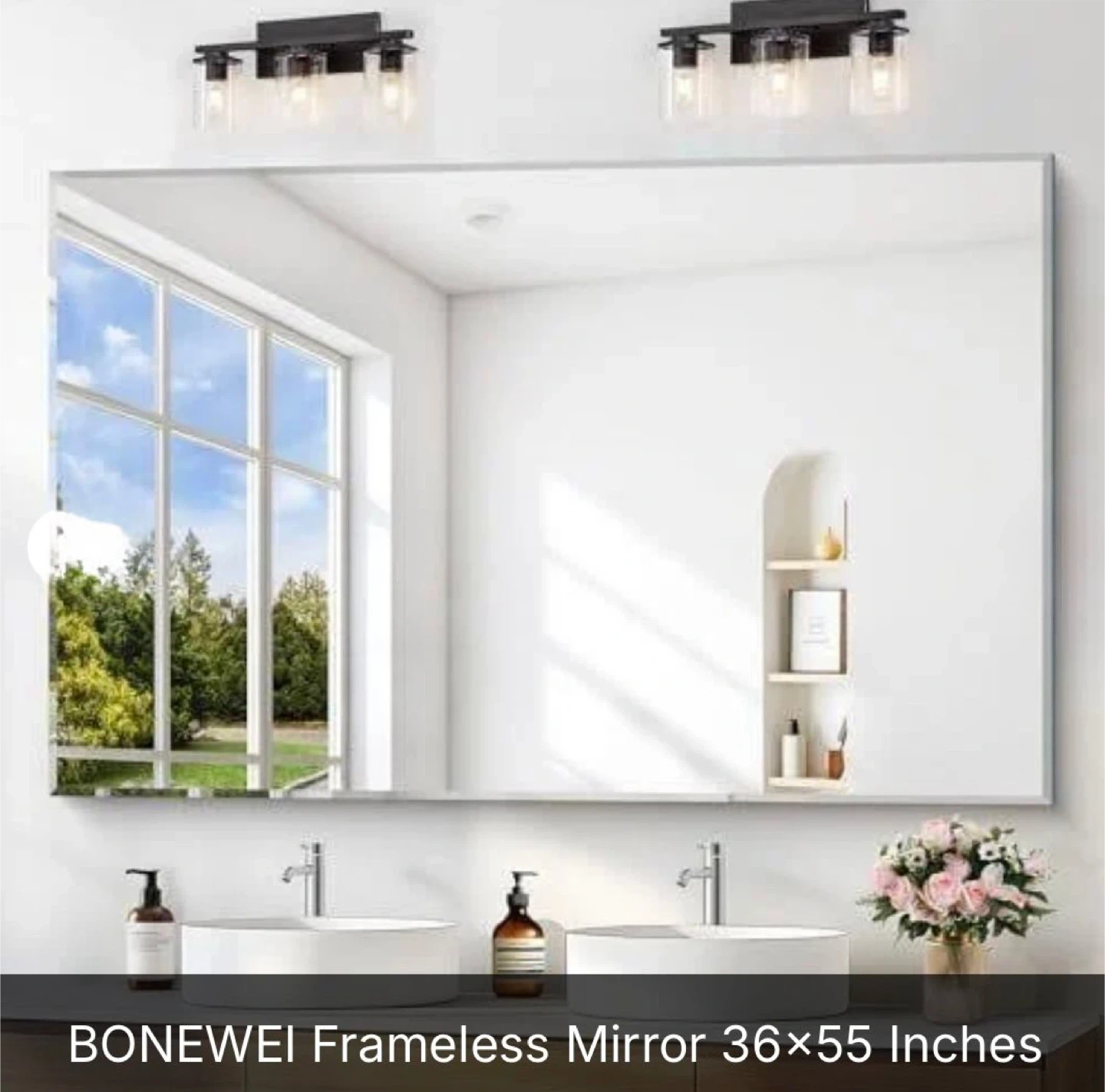 Selling a BONEWEI frameless mirror. It measures 36x55 inches and would look great in any bathroom!