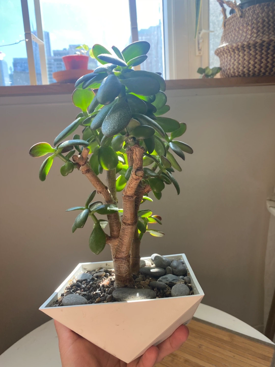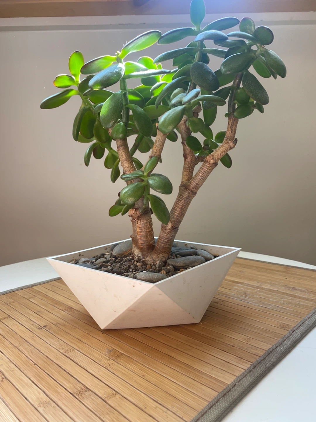 Mature Bonsai Jade (Crassula ovata) planted in a modern bonsai-style pot with drainage holes. Grown in a high-quality gritty mix for excellent drainage and root health. The plant has a thick, woody trunk that gives it a true miniature tree look. Easy to care for and thrives in bright light. A beautiful, low-maintenance statement piece for any home or office. 1 L bottle shown for scale.