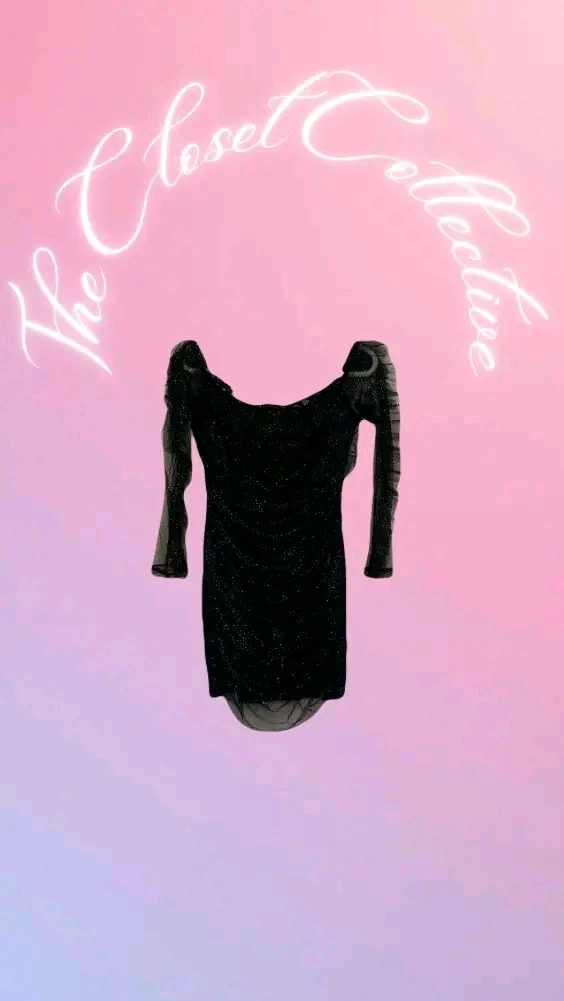 15Selling a Boohoo black glitter mesh Bardot mini dress. It's perfect for a night out! This dress features: - Off-the-shoulder neckline - Long mesh sleeves with glitter detail - Mini length