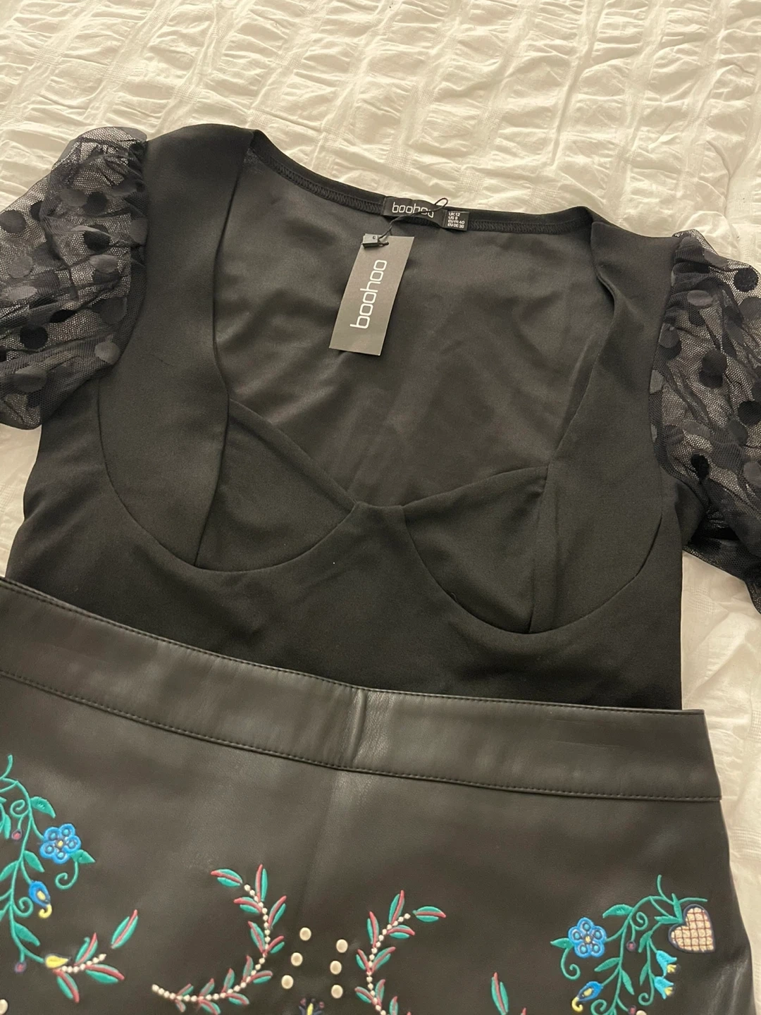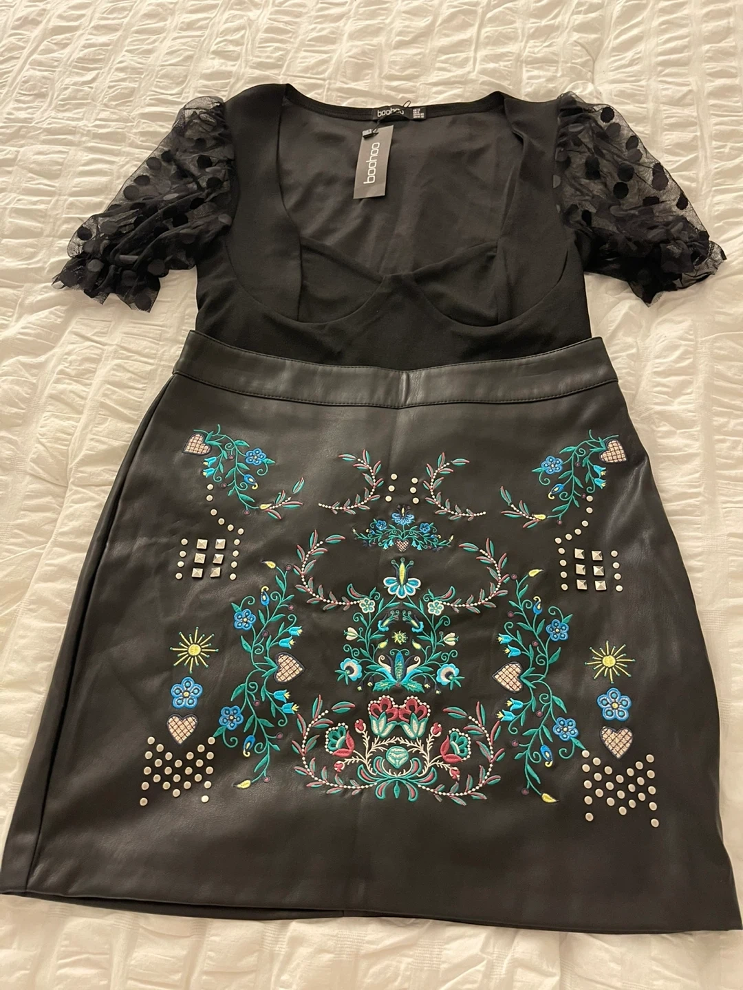 10Selling a brand new outfit! It includes a Boohoo top and a Desigual skirt. The skirt is a size 38. The top is also new with tags.size 38