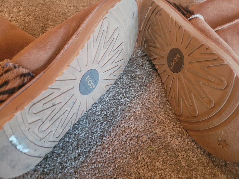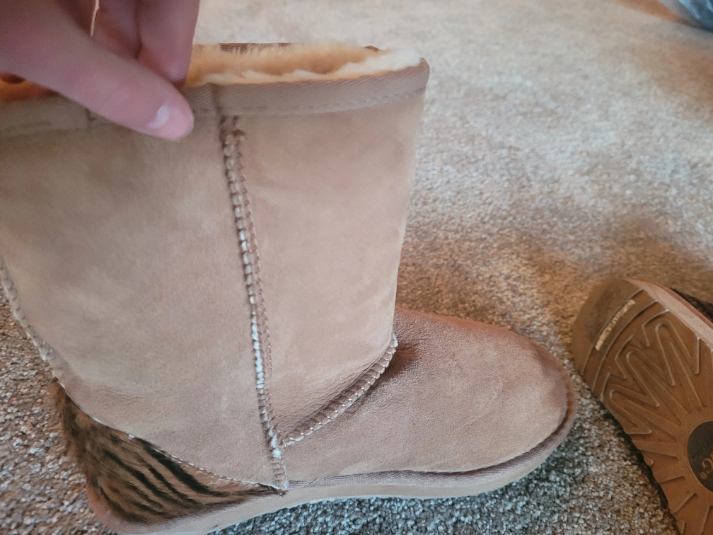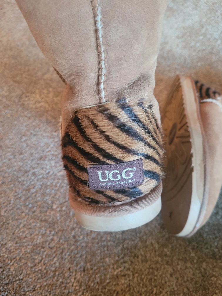 Cozy UGG boots made with genuine sheepskin and a stylish tiger print accent on the heel. They're lined with soft shearling for warmth. Perfect for keeping your feet toasty on chilly days!
