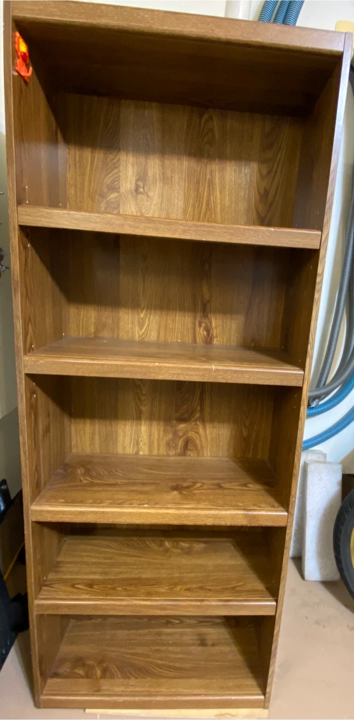 Selling a bookcase 72” tall and 28” wide and 12” deep Perfect for storing light books, displaying items, or adding some extra storage space to your home. It has a nice wood grain finish. E&OE