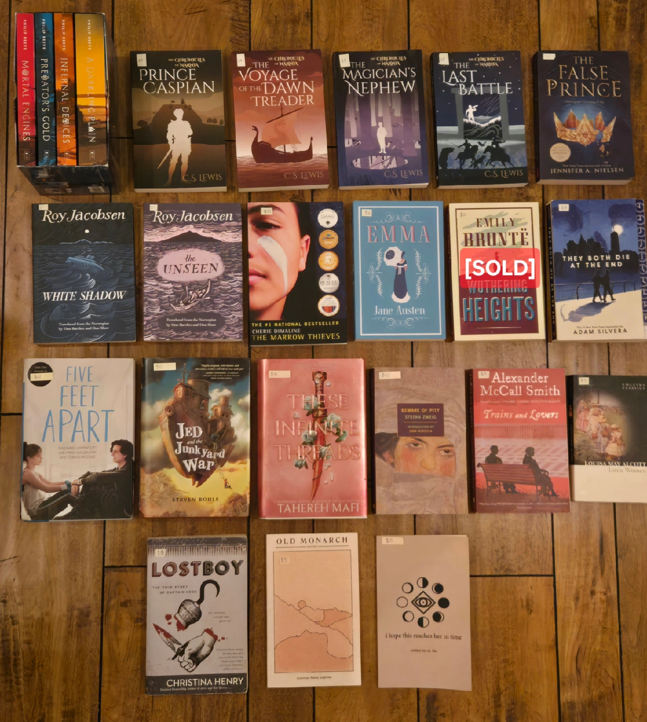 Books for Sale; Most are in Like-New Condition! (Some were only read once and have been sitting on my shelf ever since — few of which still have that new book smell) Available books: » Mortal Engines series — $25 for all four » The Chronicles of Narnia series — $7 each or $20 for all 4 » The False Prince — $5 » The Unseen — $7 » White Shadow — $7 » The Marrow Thieves — $10 » Emma — $10 » Wuthering Heights — $10 [SOLD] » They Both Die at the End — $8 » Five Feet Apart — $12 » Jed and the Junkyard War — $10 » These Infinite Threads — $15 » Beware of Pity — $10 » Trains and Lovers — $8 » Little Women — $5 » Lost Boy — $5 » Old Monarch (poetry) — $5 » i hope this reaches her in time (poetry) — $5 Everything You Need to Know to Ace... » Math — $10 » Science — $10 » English — $10 or all three for $25 *if you'd like to see a video of the books to check the condition, message me and I'll send one* Pickup at Prominade Mall Cash or e-transfer preferred