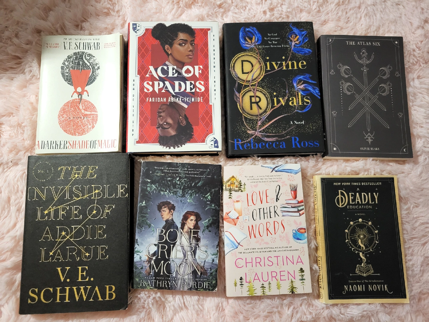 10Selling different YA books! They're all in pretty good condition! - Ace of Spades -- by Faridah Àbíké-Íyímídé - Divine Rivals -- by Rebecca Ross - The Invisible Life of Addie LaRue -- by V.E. Schwab - A Darker Shade of Magic -- by V.E. Schwab - Bone Crier's Moon -- by Kathryn Purdie - Love & Other Words -- by Christina Lauren - The Atlas Six -- by Olivie Blake - A Deadly Education -- by Naomi Novik