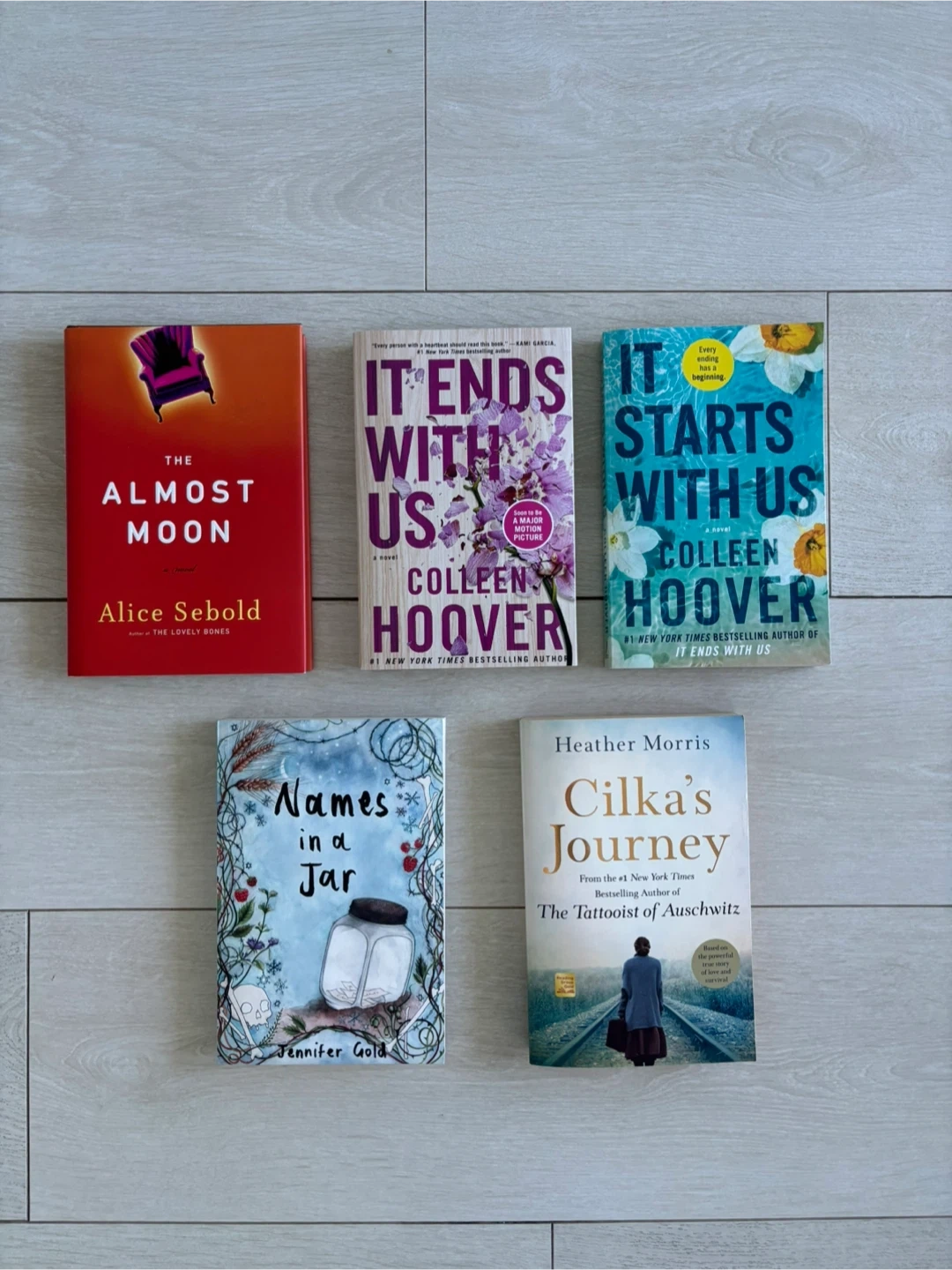 Selling books in good condition! 10$ each! - The Almost Moon by Alice Sebold - It Ends With Us by Colleen Hoover - It Starts With Us by Colleen Hoover - Names in a Jar by Jennifer Gold - Cilka's Journey by Heather Morris Pick up only in Regent Park