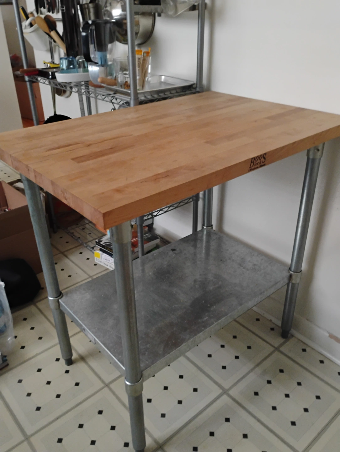 60Wooden butcher block top on metal frame. Great for extra counter space. Includes a lower shelf for storage.