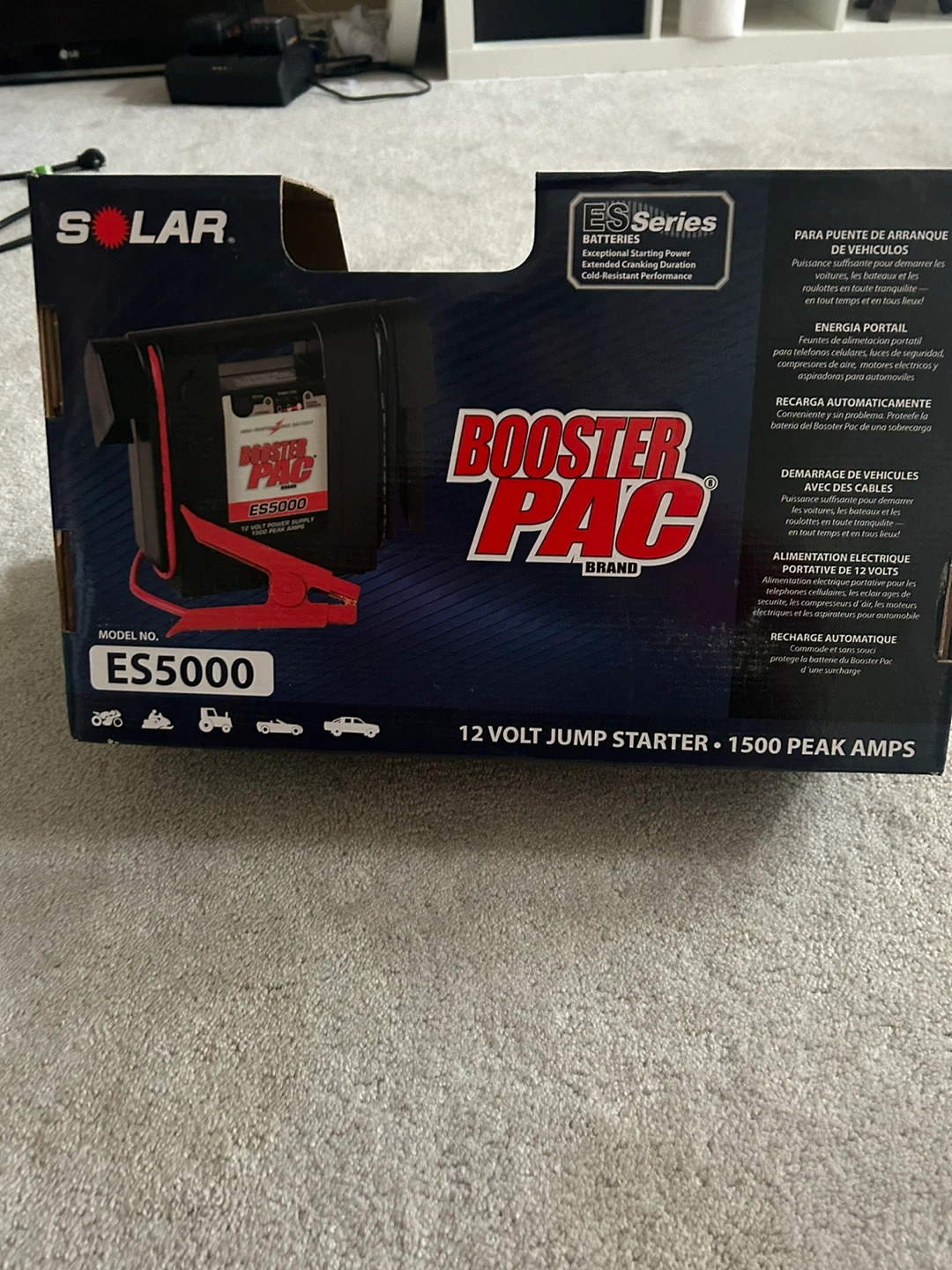 Selling a Booster PAC ES5000 12 Volt Jump Starter! It delivers exceptional starting power and extended cranking duration. It's cold-resistant too! Great for cars, boats, and more. It can also be used as a portable 12V power source for phones, lights, and other devices