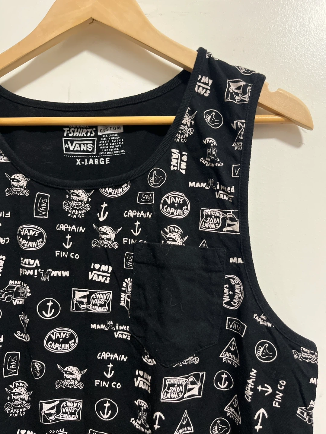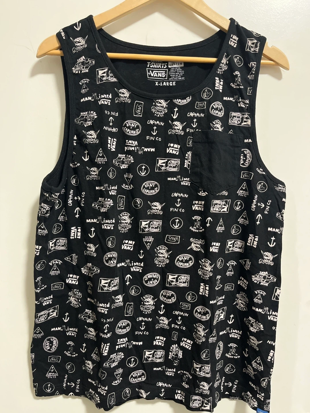 Black Vans tank top with an all-over graphic print. It's a size X-Large and has a front chest pocket. Made of cotton for comfort.