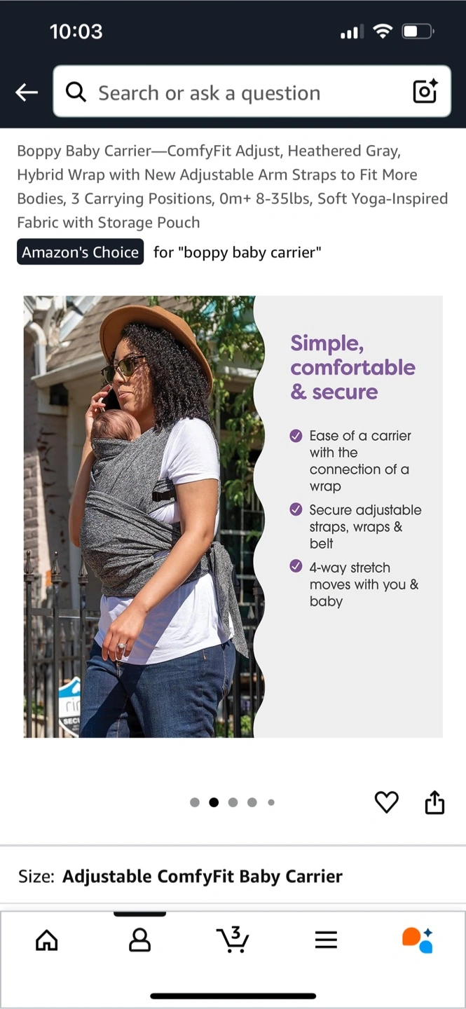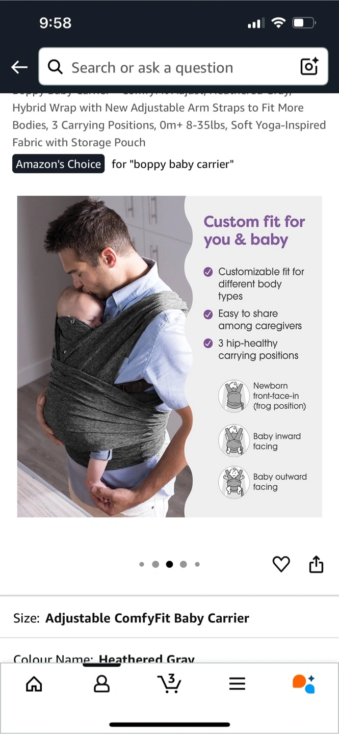 21Selling a Boppy ComfyFit baby carrier in heathered gray. It's adjustable for a custom fit for you and baby. It's designed to be simple, comfortable, and secure. It has adjustable straps, and the 4-way stretch moves with you and baby. Suitable for babies 0m+ to 35lbs