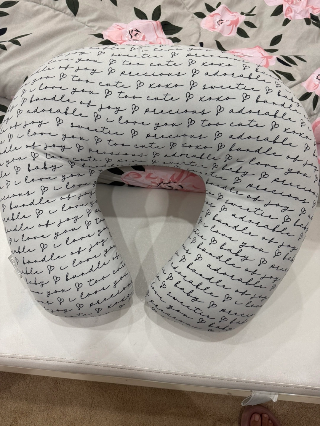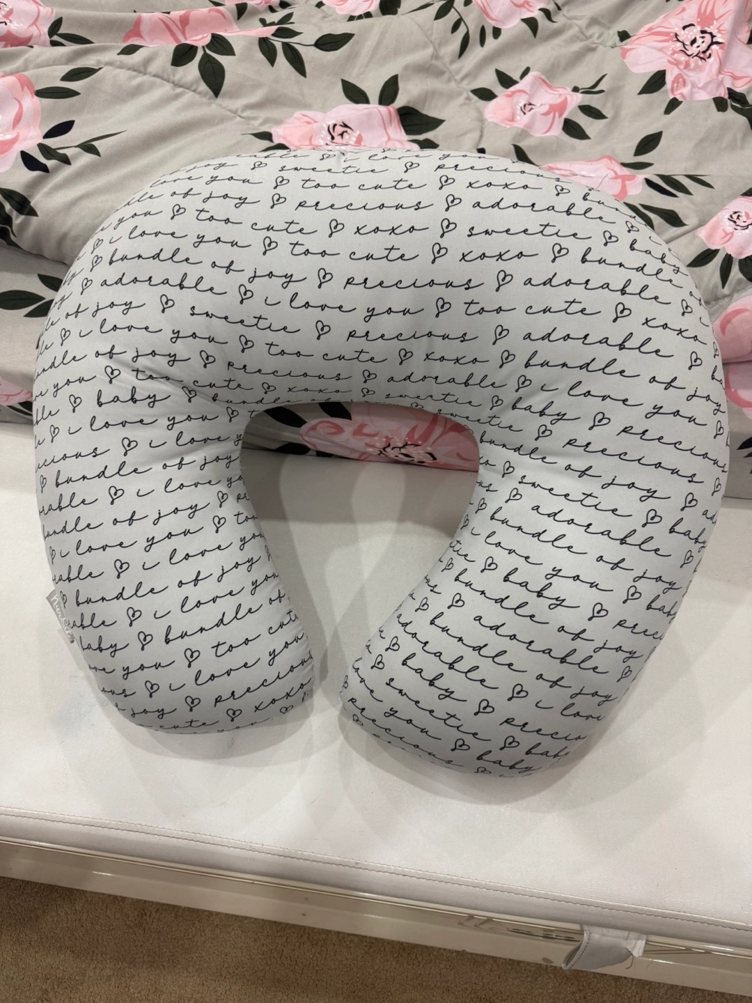 Selling a Boppy nursing pillow in great condition! It features a cute grey and white pattern with words like 'adorable,' 'precious,' and 'I love you'. Perfect for supporting your baby during feeding time