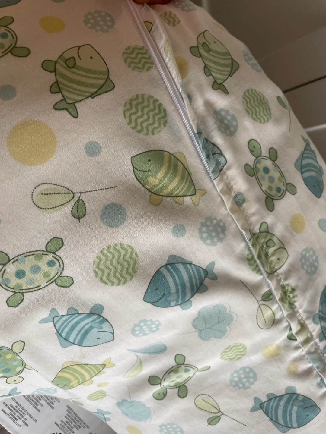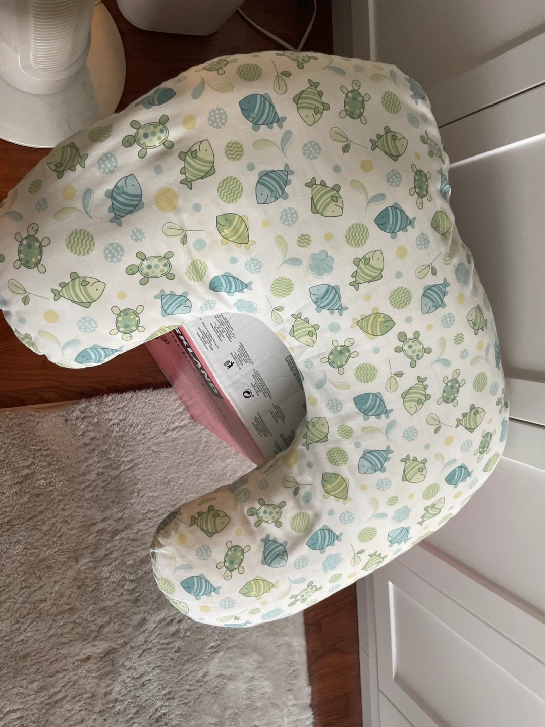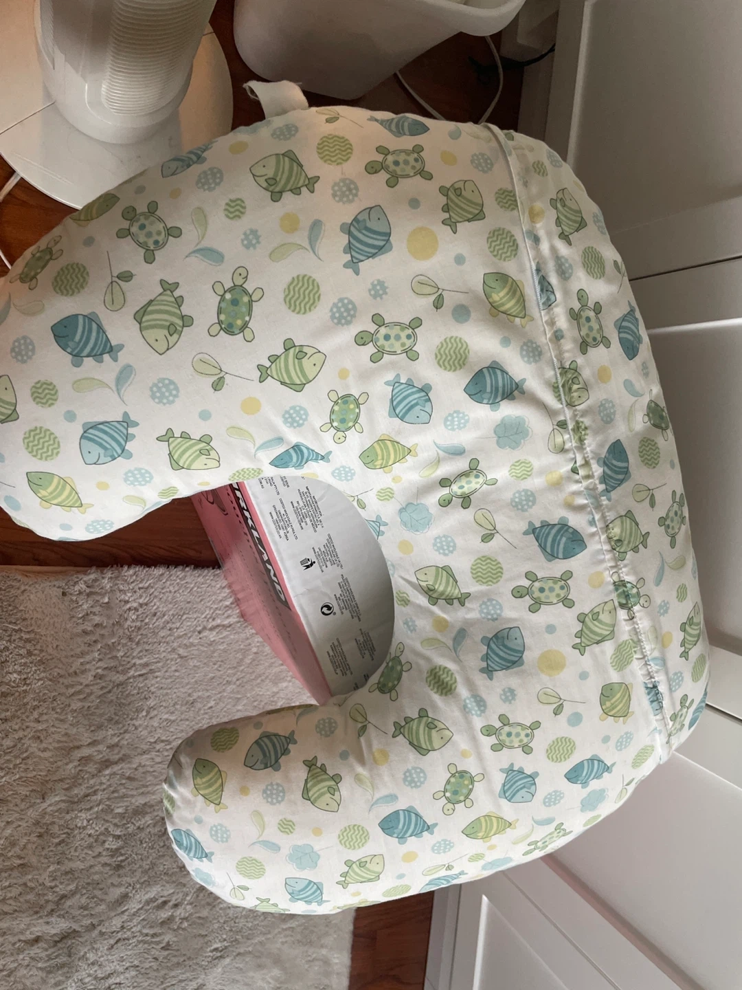 65Gently used Boppy nursing pillow with a cute fish and turtle patterned cover! It's in great shape and perfect for feeding time. Provides support and comfort for both you and your little one. Cover washable.