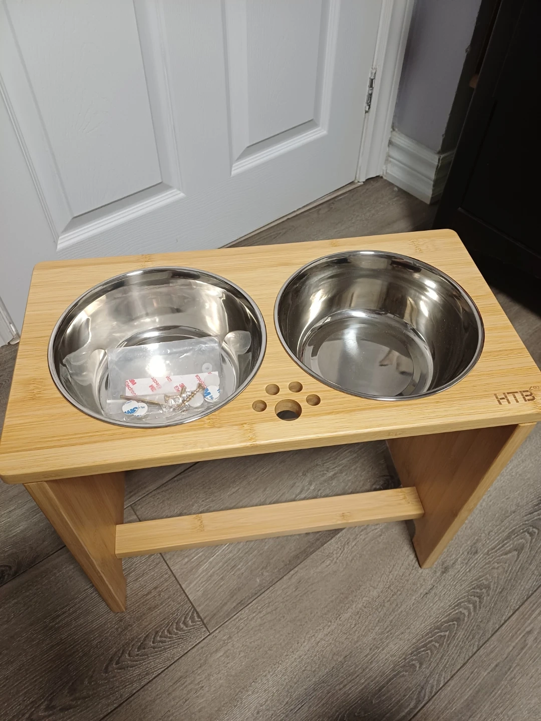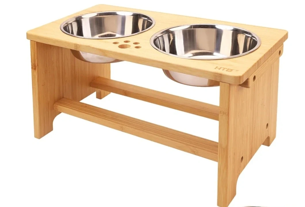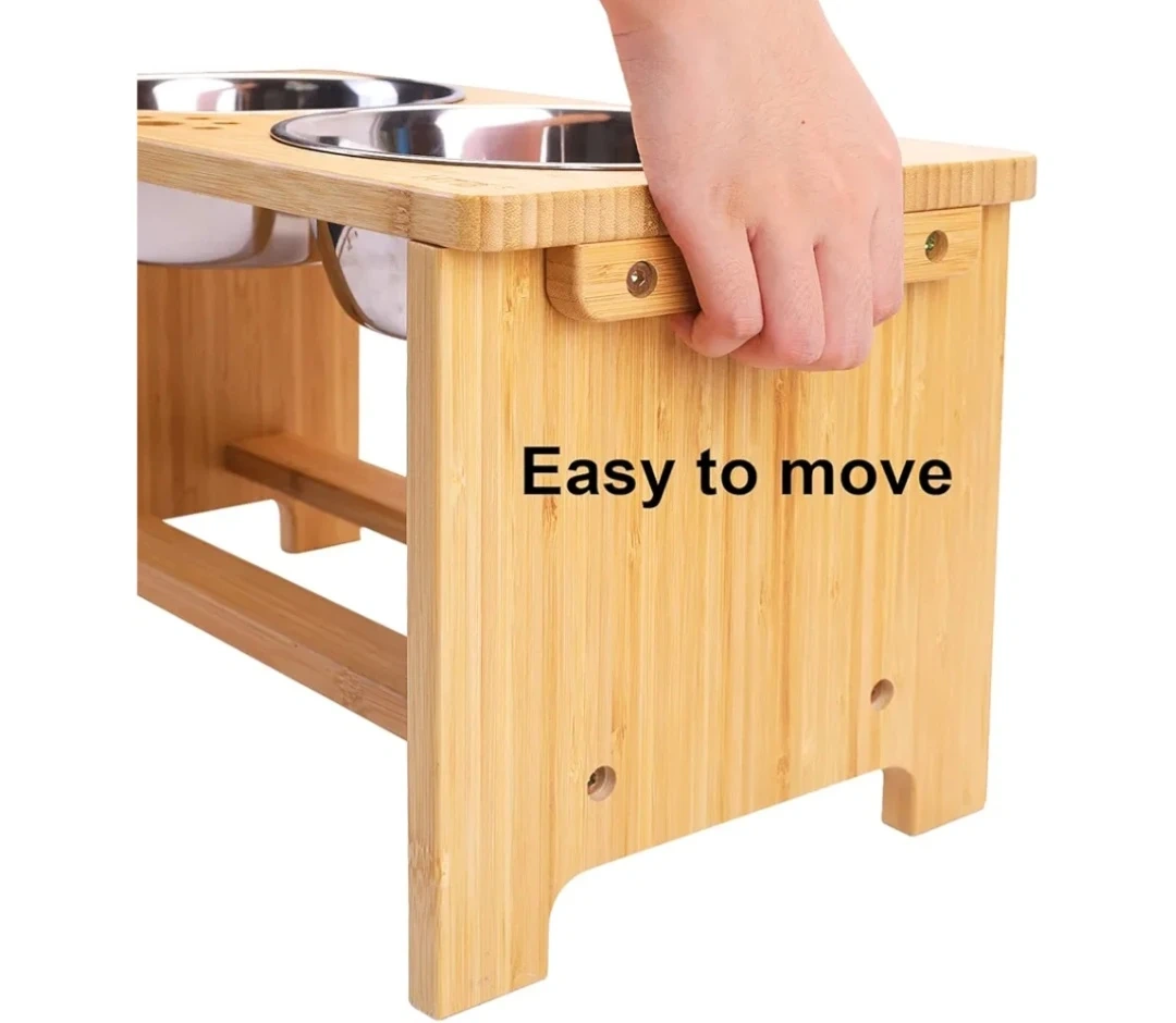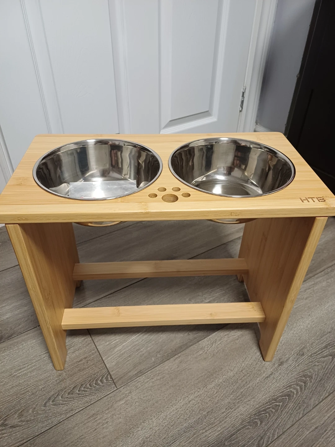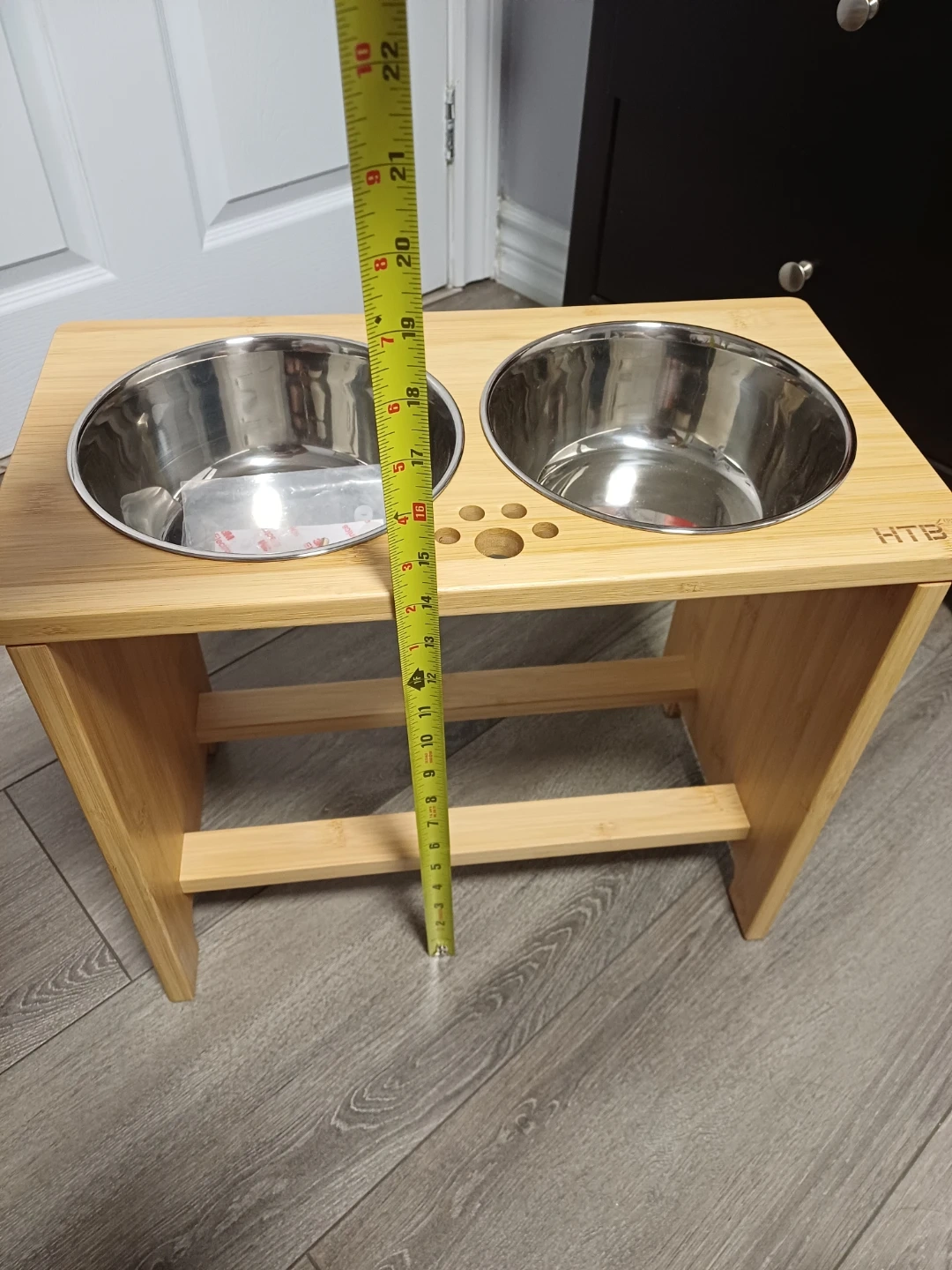 Elevated pet feeding station with two stainless steel bowls. Bamboo stand construction measuring 17.3 inches long, 9.5 inches width and about 14 inches in height which helps reduce strain on your pet's neck, bowls diameter is approximately 7 inches.