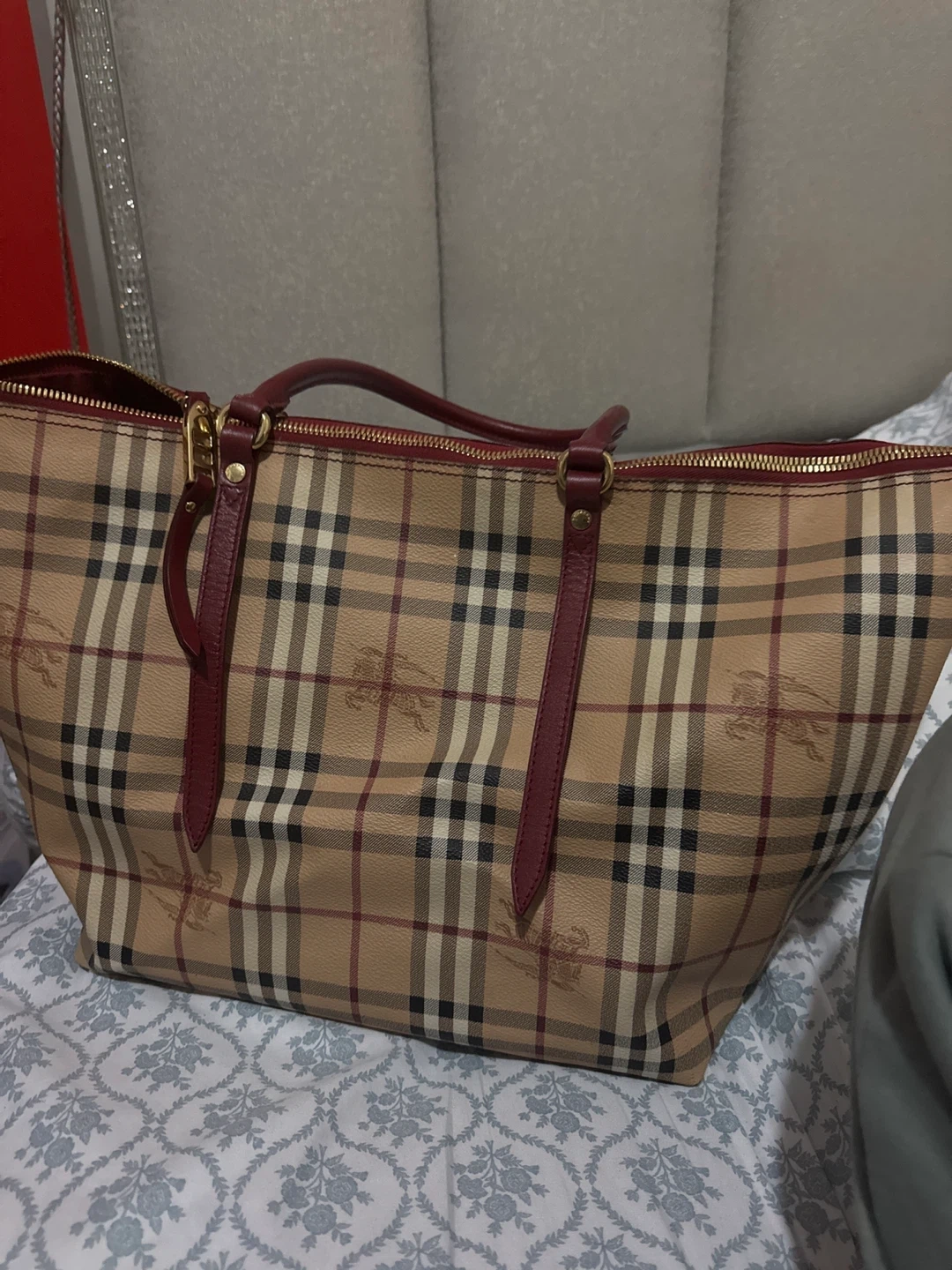 Selling a Burberry tote bag with the classic Burberry plaid pattern and burgundy straps. It's in great condition and ready for a new home!