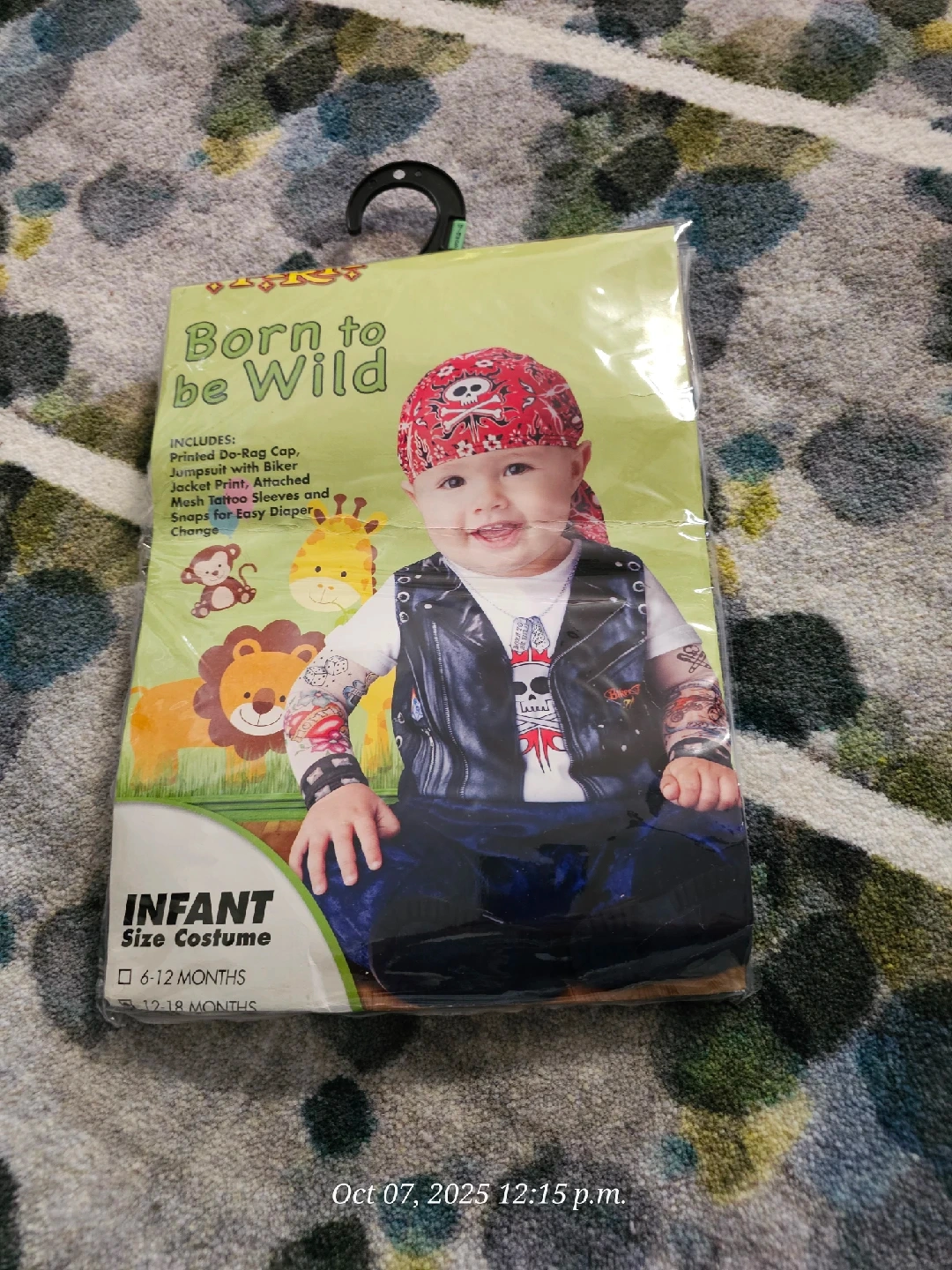 10Get your little one ready to rock with this adorable "Born to be Wild" infant costume! It includes a printed do-rag cap, a biker jacket printed top, and bottoms with snaps for easy diaper changes. The size is for infants 12-18 months.