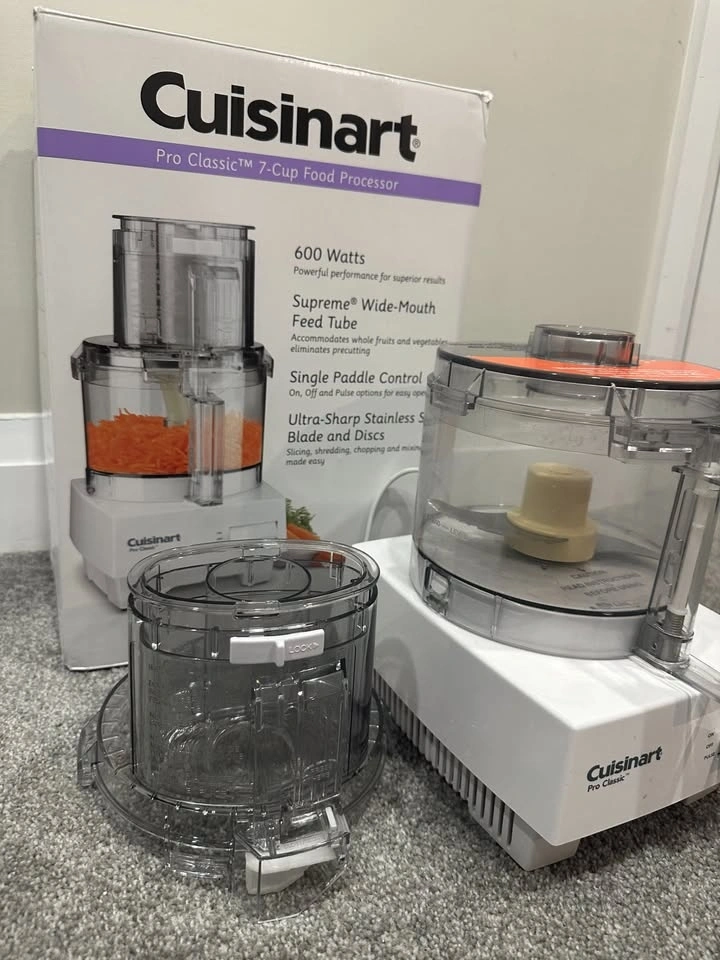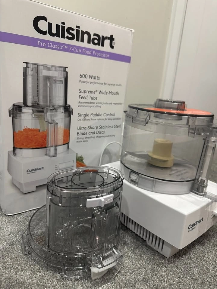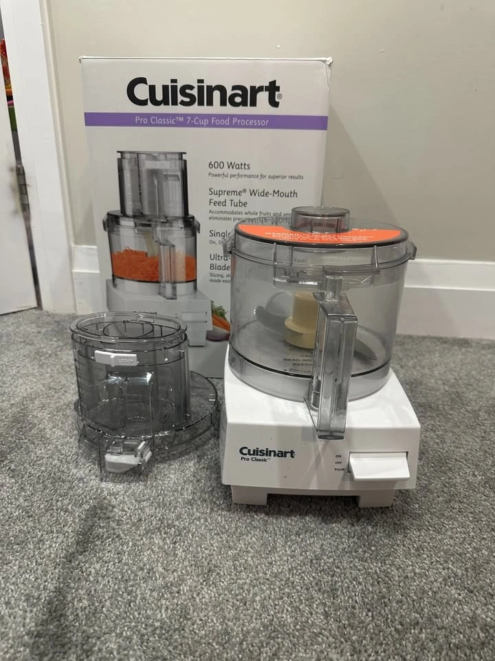 Unlock culinary brilliance with the Cuisinart Pro Classic 7-Cup Food Processor! This powerhouse appliance is your secret weapon for flawless meal prep, transforming everyday cooking into an effortless joy. From perfectly sliced veggies to finely chopped nuts and silky-smooth purees, experience professional results in your home kitchen. Key Features: Powerful Performance: Robust motor easily handles tough ingredients. Generous 7-Cup Capacity: Ideal for family meals or batch prepping. Effortless Control: Simple on/off/pulse controls for precision. Easy to Clean: Removable parts are dishwasher safe for quick cleanup. This Cuisinart Pro Classic (Model DLC-10SYP1A) is in perfect working condition. Location: Rymal Rd & Columbus gate. Cash only. Bug, pet & smoke free home. If post is still up, item is available.