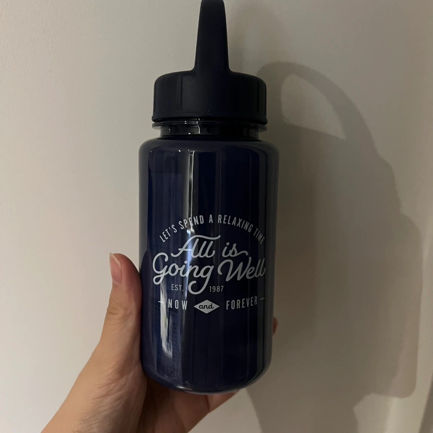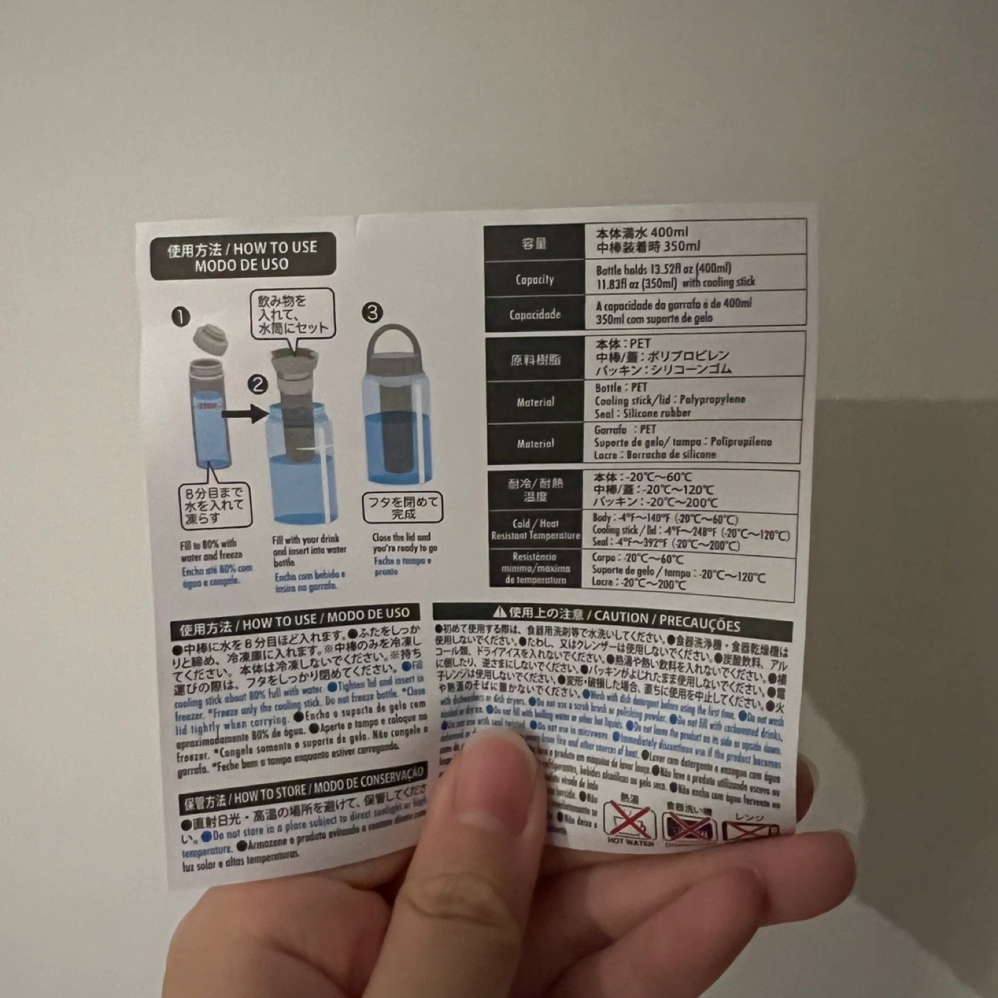 Dark blue water bottle has a capacity of 350ml and includes a cooling stick. You can make ice and put in it to keep the bottle cool. Brand new.