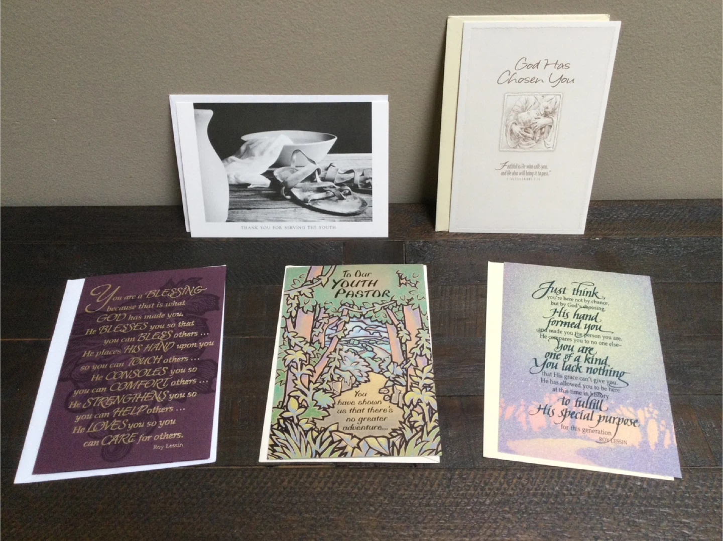 Free lot of religion inspirational greeting cards with uplifting messages. One card thanks the youth, another is for a youth pastor, and two offer general blessings and encouragement. They're great for sharing faith and support.