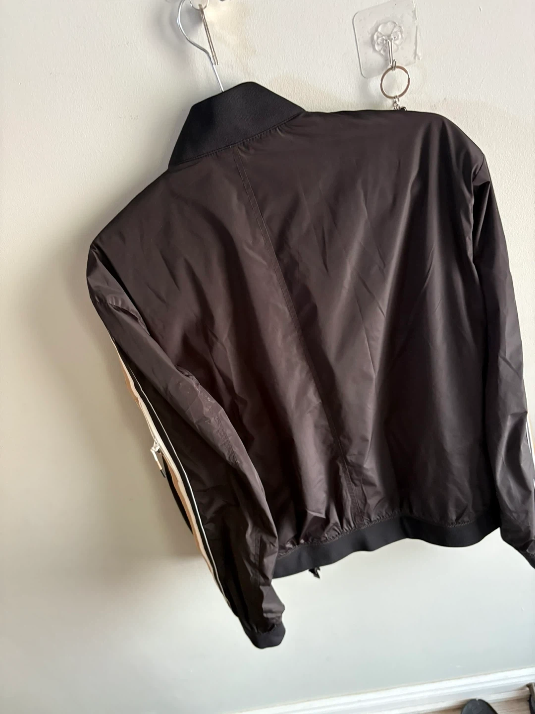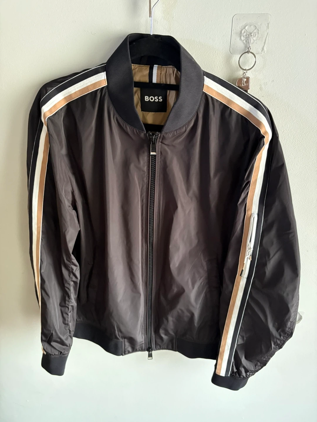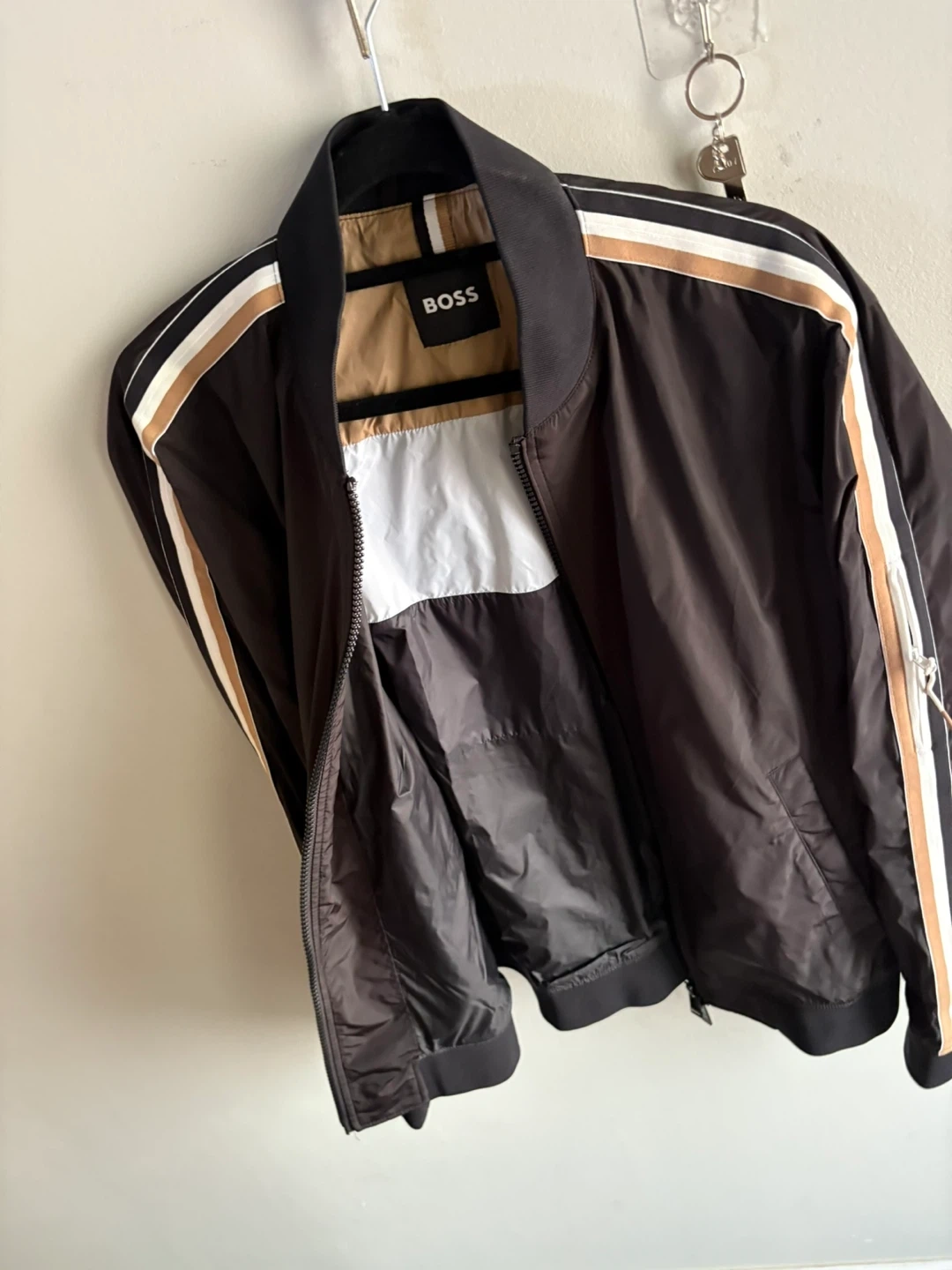 Selling a BOSS jacket in excellent condition. It's a stylish bomber jacket with a zipper. The jacket features a black, white, and brown stripe design on the sleeves. Perfect for adding a touch of class to your wardrobe!