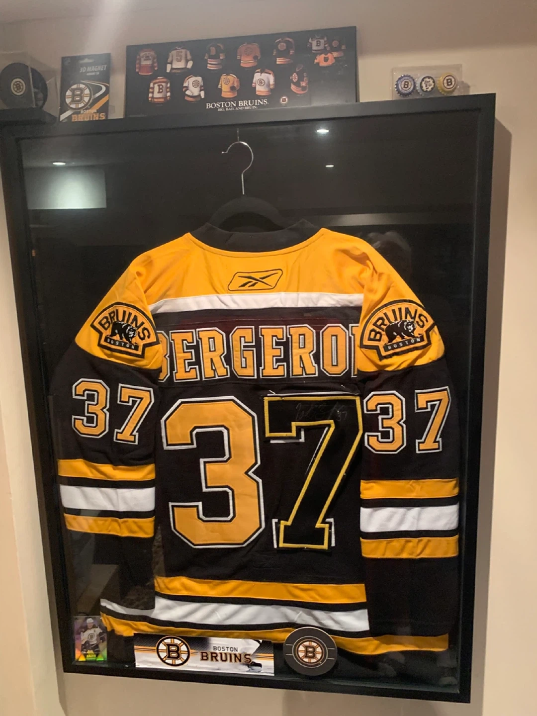 10Selling a Boston Bruins Bergeron #37 jersey, framed and ready to hang! This jersey is a great piece for any Bruins fan or hockey memorabilia collector. Comes with an additional signed number 7 by Patrice Bergeron.