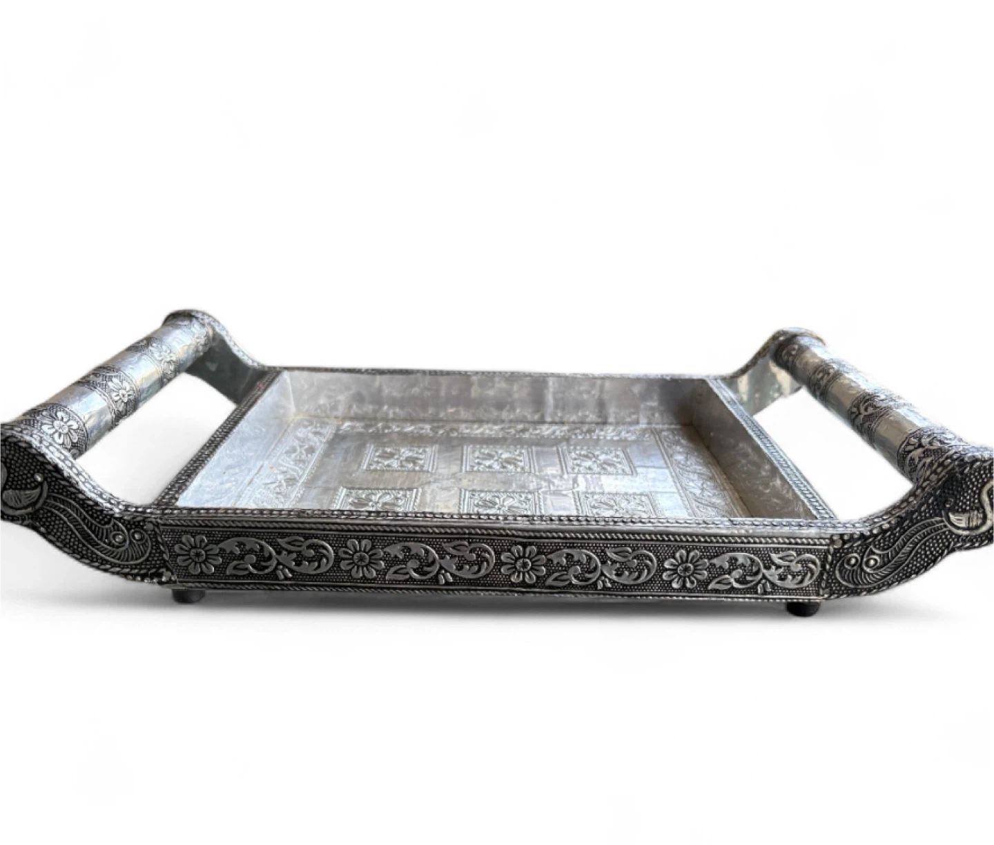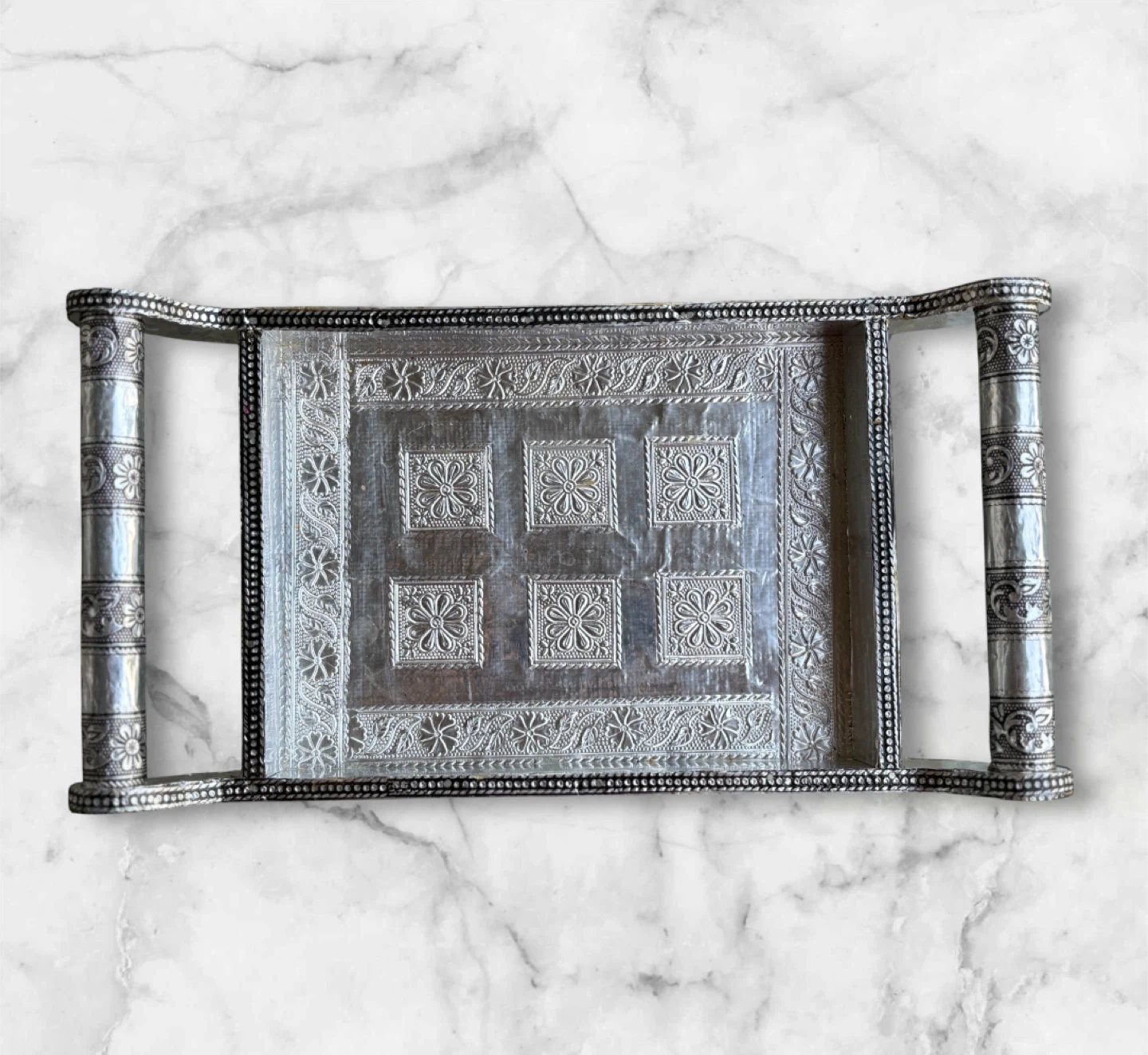 88Selling 2 decorative serving trays. 1. Wooden Handmade Antique Design Decorative Serving Tray. 2. Vintage stainless steel tray, Metal tray with handles, Floral pattern flowers. Both for $10; moving sale. Looks like new only.