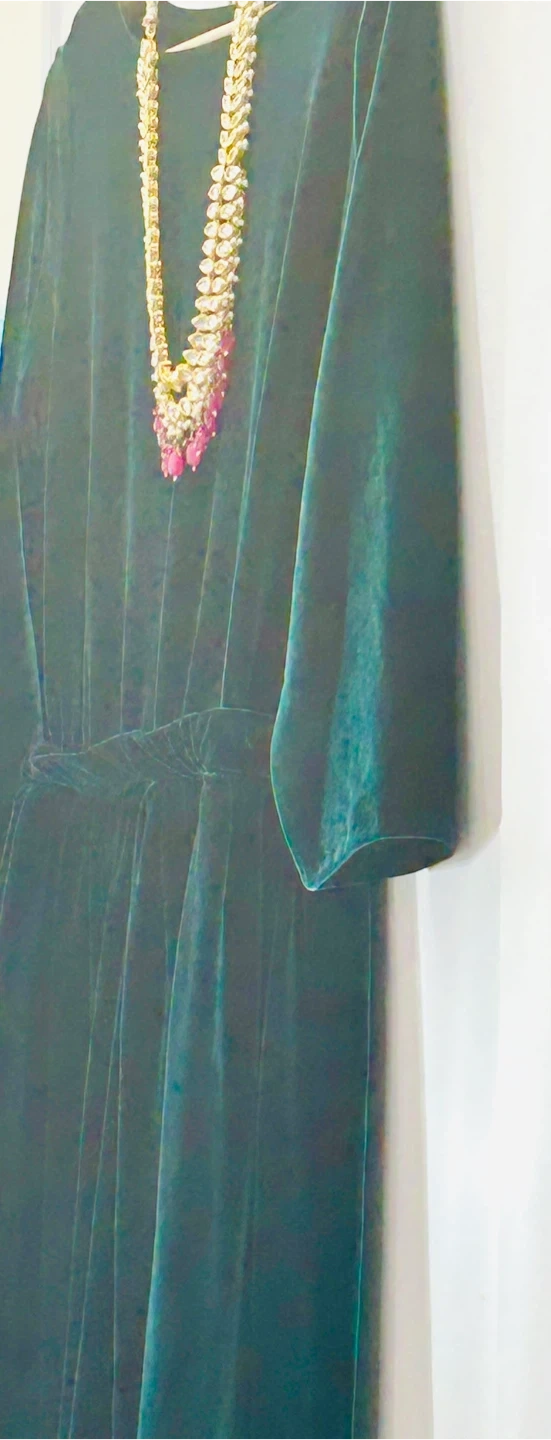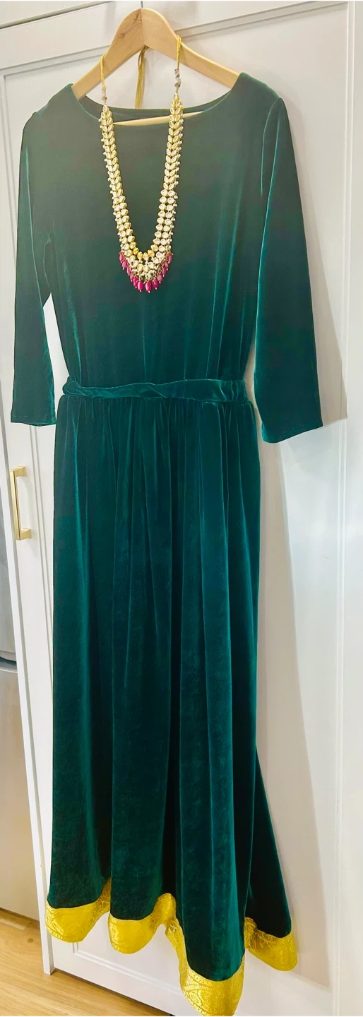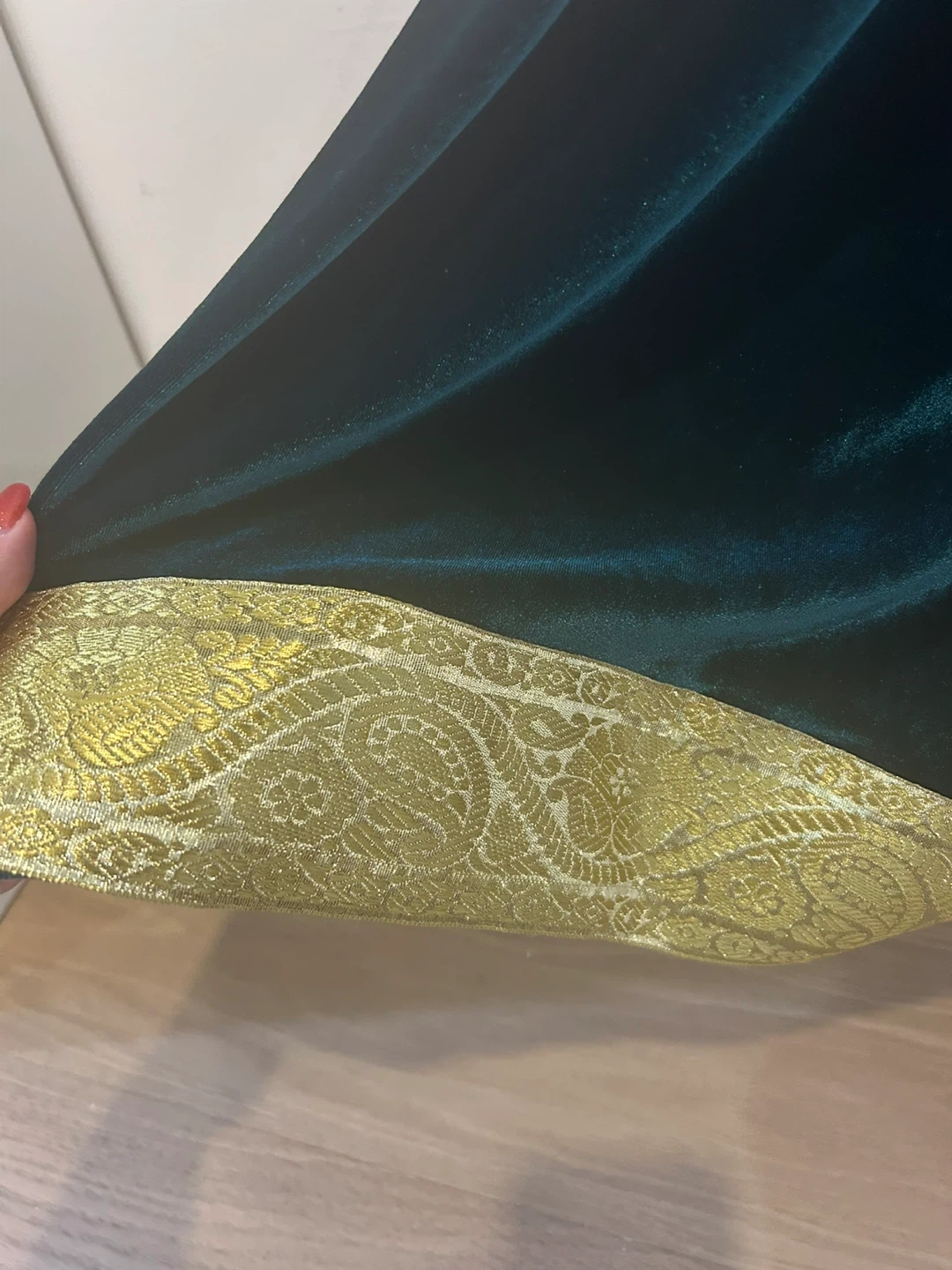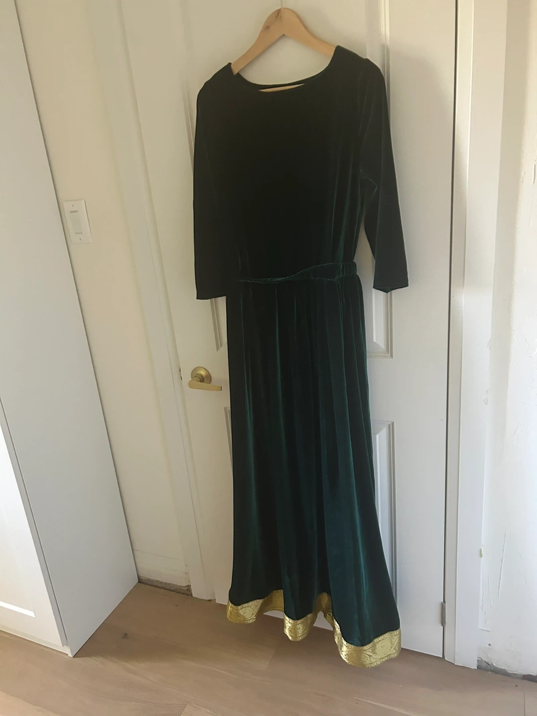 10Selling a beautiful bottle green velvet dress! It has a gold trim at the bottom and a tie at the waist. It's in great condition and ready for a new home! It’s stretch velvet so it fits between a size 10 and 14 comfortably. It’s floor length for someone 5’7” The pictures don’t do it justice, the colour is rich and the skirt has a wide flare. Great for a winter wedding. Necklace not included.