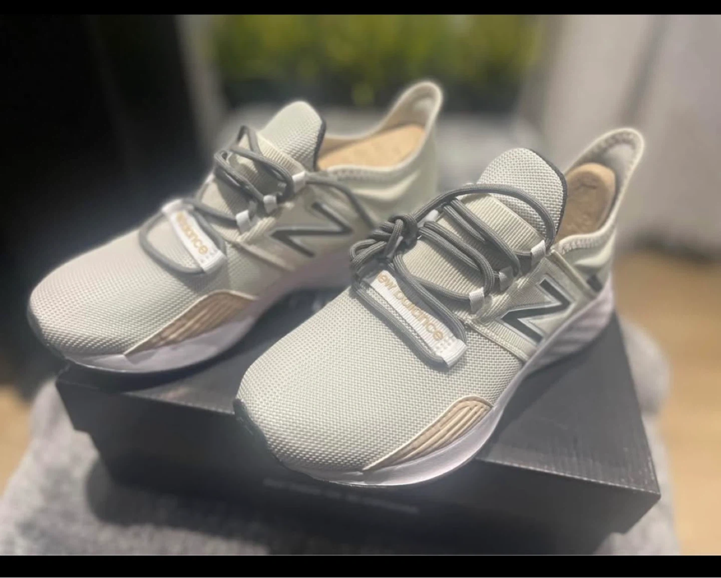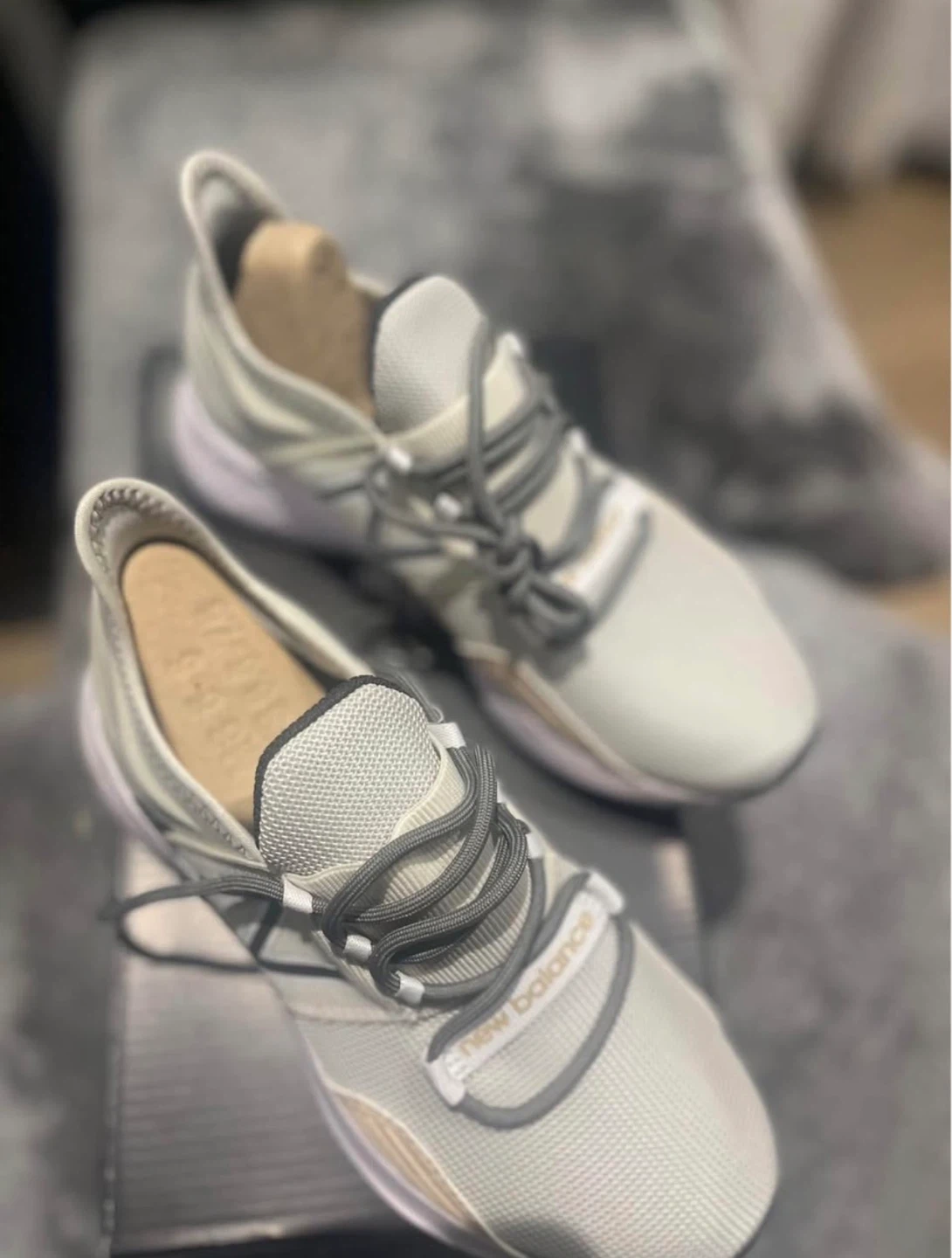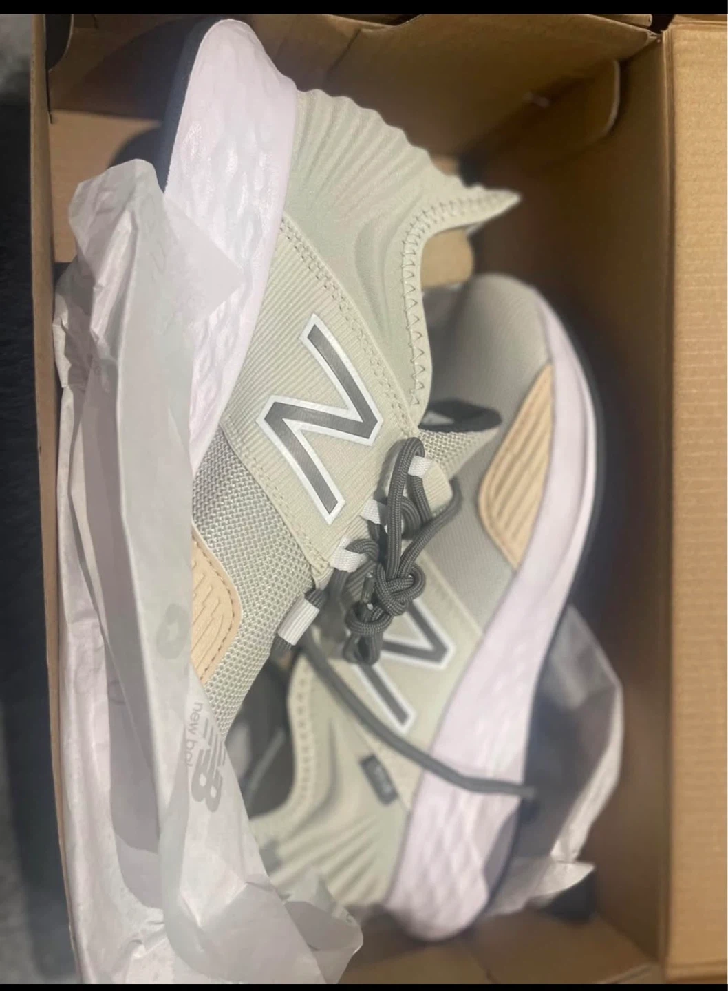 These New Balance running shoes are designed with Fresh Foam X cushioning for a comfortable stride. They feature a light grey and beige colourway. The original box is included with your purchase!
