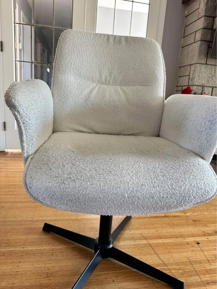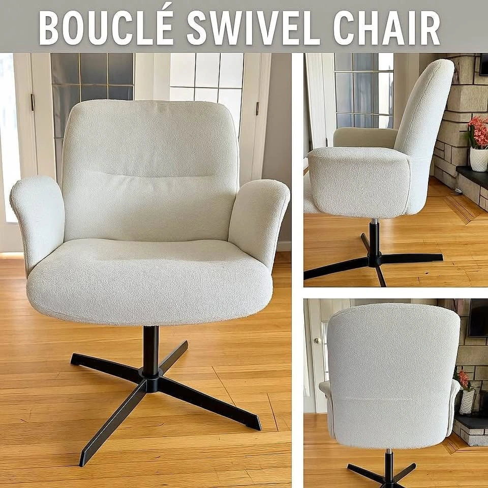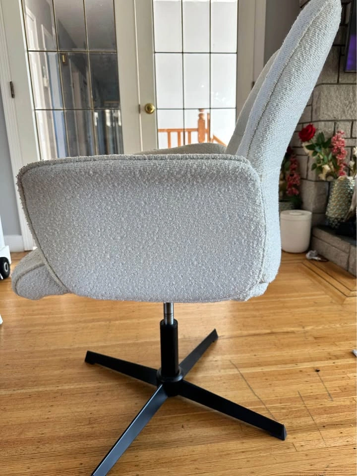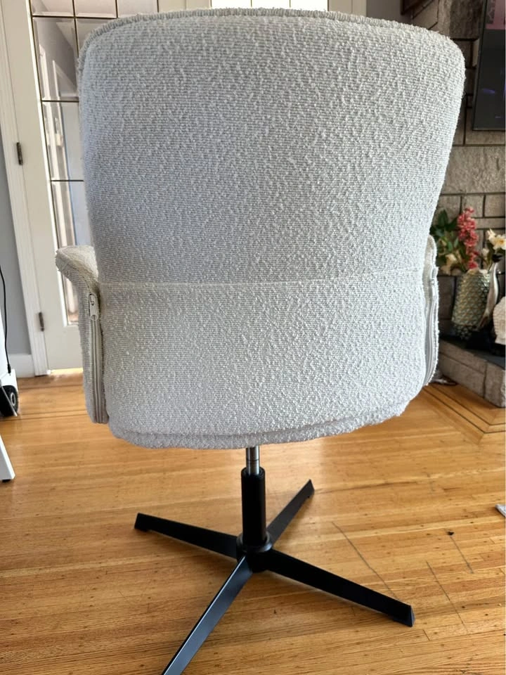 Modern cream bouclé swivel chair with sleek black metal base. ✨ Features: • 360° swivel function • Soft, textured bouclé fabric – cozy and stylish • Sturdy black metal base • Perfect for living rooms, offices, or reading nooks Excellent condition – clean and from a smoke-free, pet-free home. Asking $80 OBO – save compared to $175 retail. Pick up in Tsawwassen