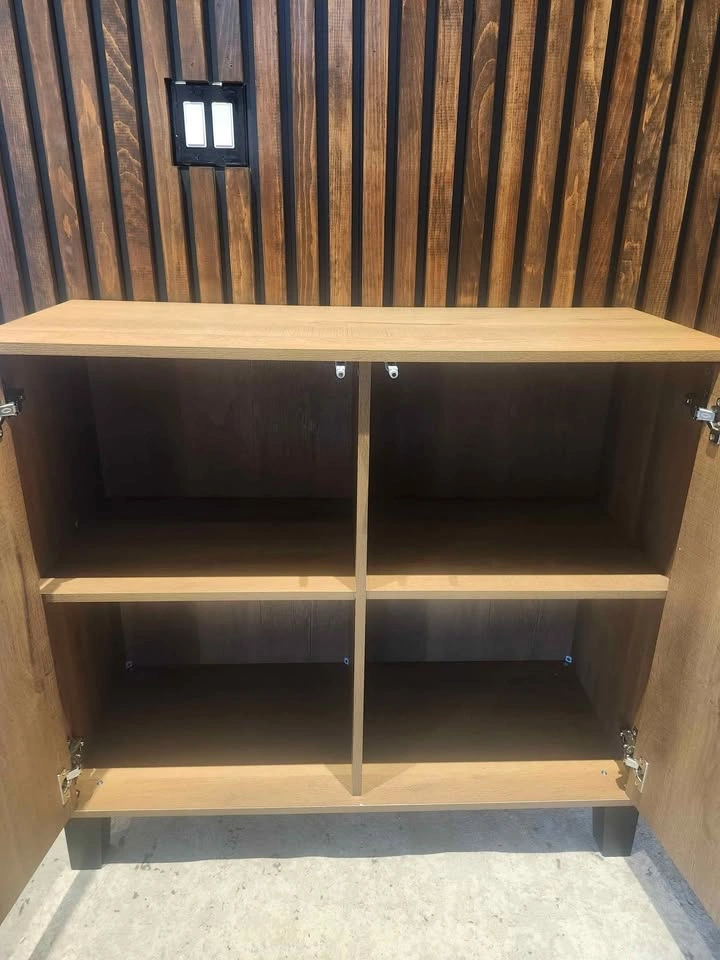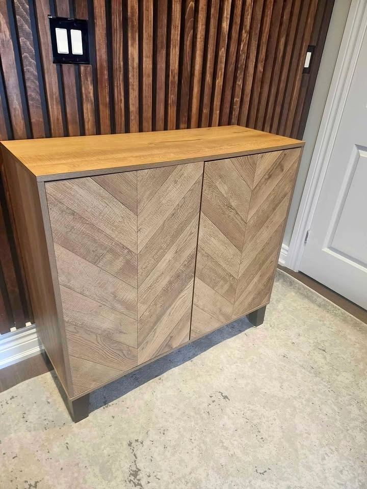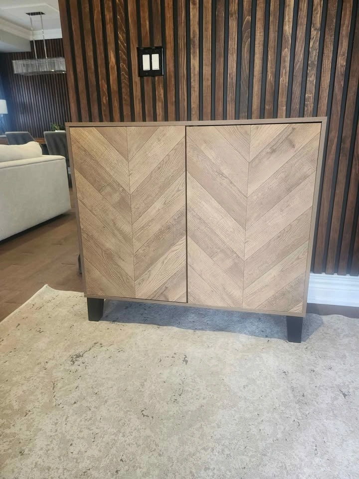 62Wooden chevron cabinet. In great condition. Back leg has some damage but not noticeable as its facing the wall. Its a great decorative piece to dining area, living area (I used this as a bar) or front hall Dimensions 39.5" W x 36" W x 15.5" D