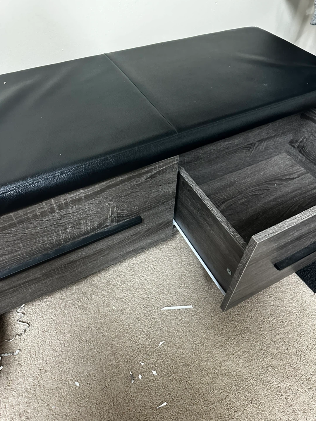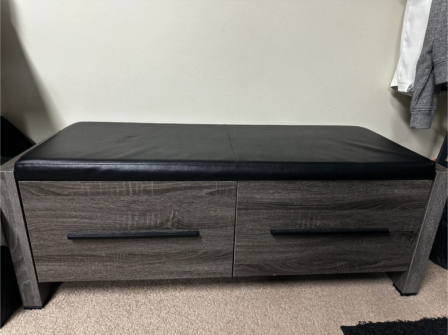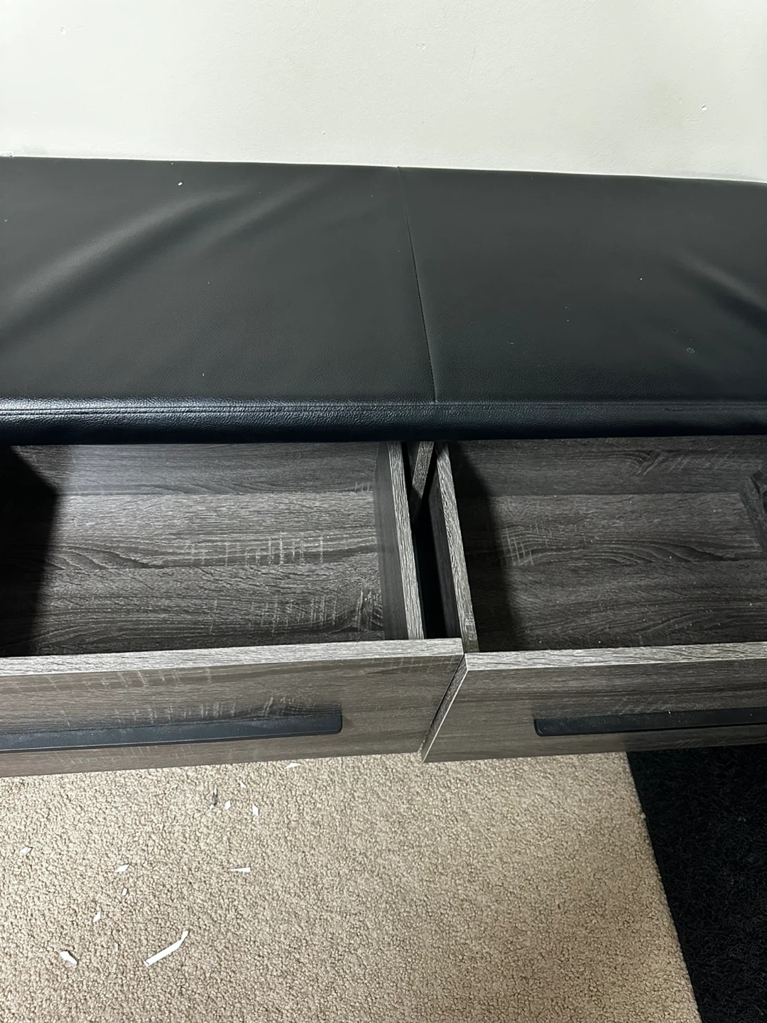 10This storage bench from Bouclair is perfect for adding extra seating and storage to any room. The bench features a grey woodgrain finish with a black faux leather top. It has two drawers for storage, making it a practical and stylish addition to your home.