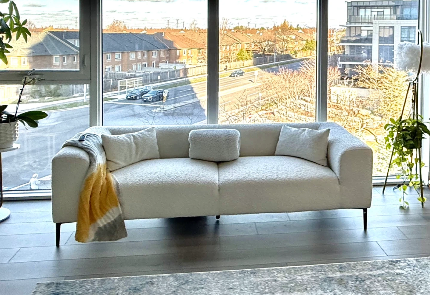 Selling a beautiful boucle sofa that's in like-new condition! It's a stylish and comfy addition to any living space. The soft, textured boucle fabric adds a touch of elegance and coziness. Perfect for lounging and relaxing after a long day!