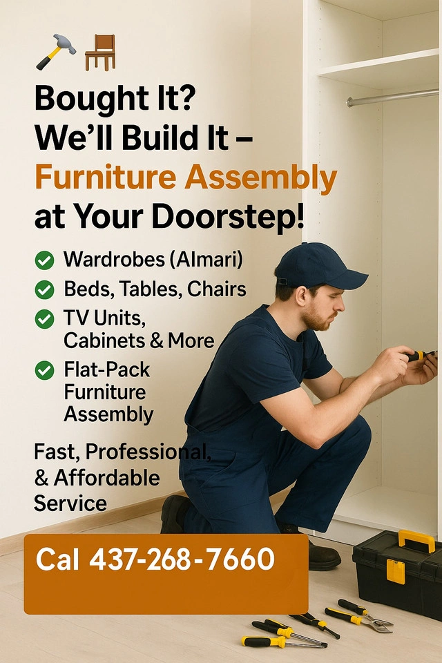 75Bought Furniture from IKEA or Any Store? Let Us Handle the Assembly – At Your Doorstep! ✅ Wardrobes (Almari) ✅ Beds, Tables, Chairs ✅ TV Units, Cabinets & More ✅ Flat-Pack Furniture Assembly ✅ Fast, Professional, & Affordable Service Avoid the hassle – We bring tools & experience! Expert Technician with 10+ Years of Experience Serving Please Contact Call or WhatsApp Now to Book: 4372687660