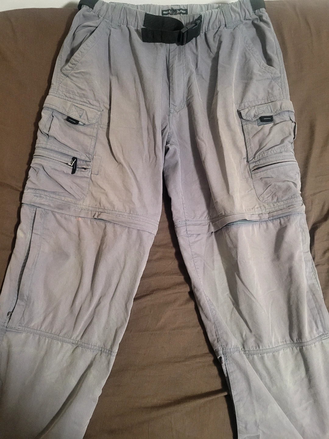 Selling a pair of Boulder Gear convertible cargo pants. They're a light grey colour and have lots of pockets. SIZE XL Bought at a thrift store in square one called throwback vault for 50 dollars they have alot of zipper pockets and can turn into cargo shorts you can make some nice outfits with these amazing Cargos need gone asap looking to get rid of fast pick up only around shierdan mall and Erin mills pwky Message for more