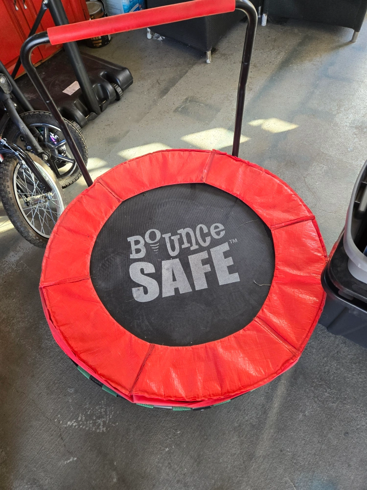Selling a Bounce Safe mini trampoline! It's in great shape and perfect for some indoor fun. The trampoline features a red padded edge and a handlebar for added safety and stability. Great for kids!