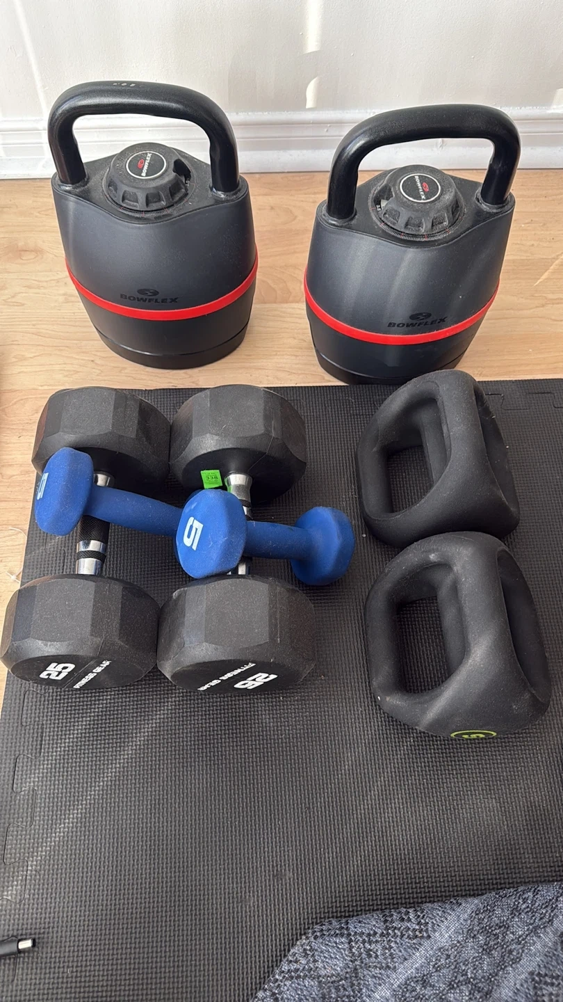 Bowflex Dumbbells on the listing already sold Selling a set of Bowflex adjustable kettlebells and a couple of standard dumbbells as well as an exercise bench! 2 x 25 lbs dumbbells 2 x 5 lbs (blue) dumbbells 2 x weight adjustable kettlebell with holding stand 2 x Ybells that can be used as a push-up stand, as a light kettlebell, also as a light dumbbell 1 exercise bench