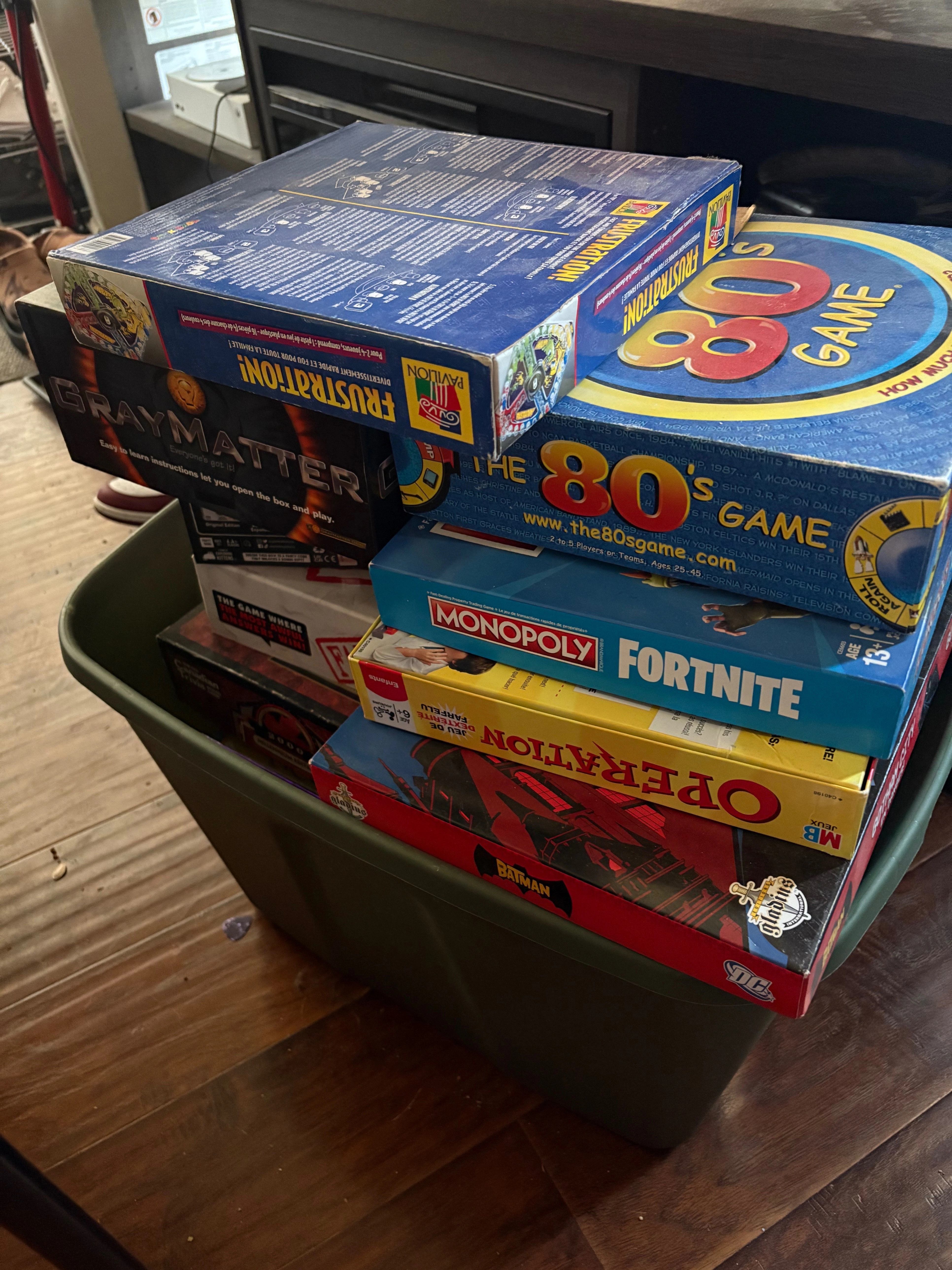 15Box of assorted games used throughout the years. The box includes the following games. Frustration The 80's game Graymatter Monopoly (Fortnite addition) Poetry For Neanderthals Operation The Batman Connect 4 Fail Let's Hit Each Other With Fake Swords The All Canadian Trivia Game Pictionary Monopoly ( Pokemon addition) Trivial Pursuit 80's addition