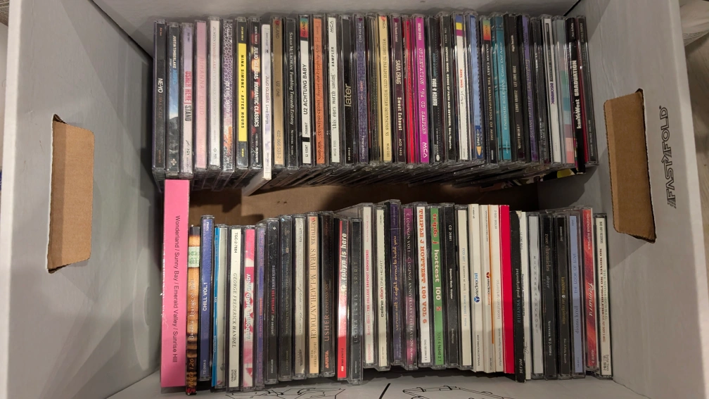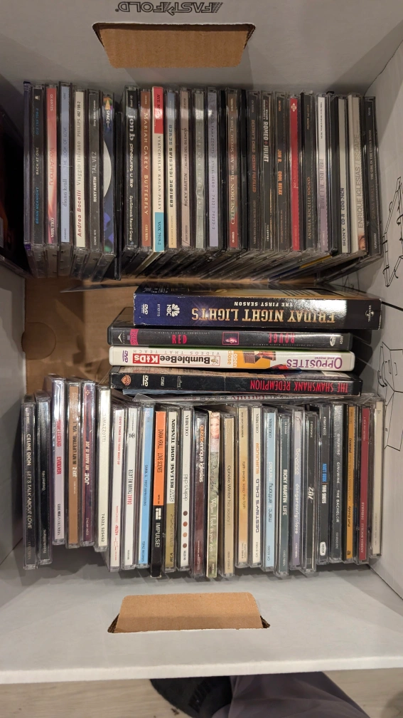 Selling a box full of CDs and DVDs! There's a variety of music and movies here, perfect for someone looking to expand their collection or enjoy some classics pick at 1$ each minimum 5, or the lot for 50$